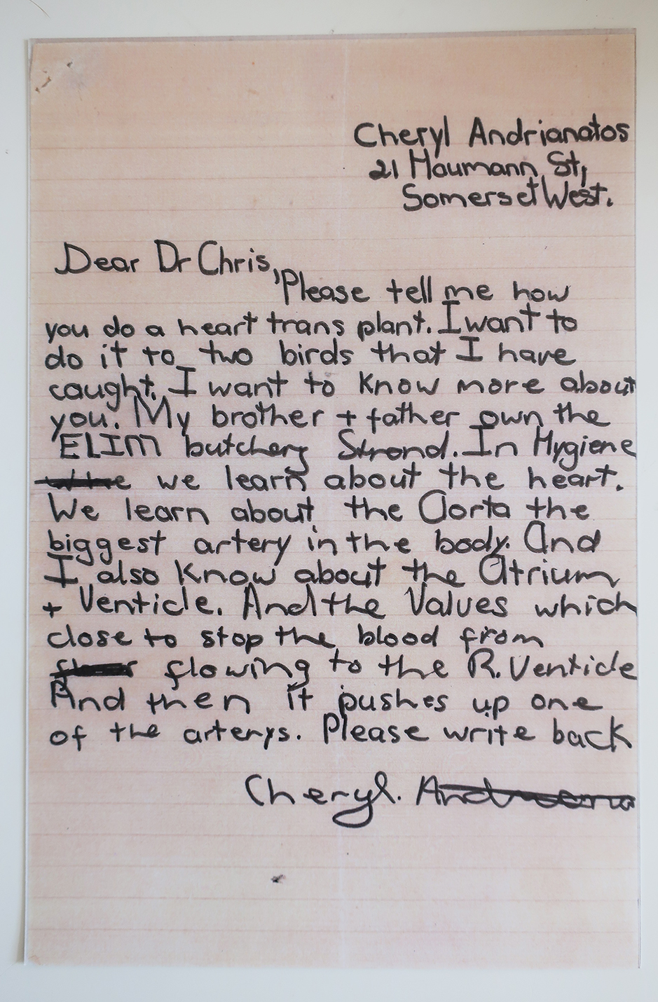 Hospital on 3 December 1967. In one, a little girl asks him how to perform a heart transplant on the dead dove she found in her garden, while in another a girl relates how she caught a fish she thought was dead, but whose heart started beating again a few hours later ('Can you explain that?' and 'If a doctor says you're dead and they take out your heart but it is still beating, are you dead or alive?'). Courtesy of the Heart of Cape Town Museum, University of Cape Town, Department of Health Sciences.
