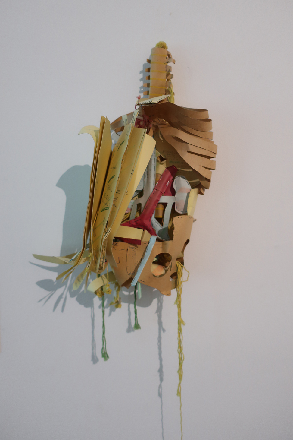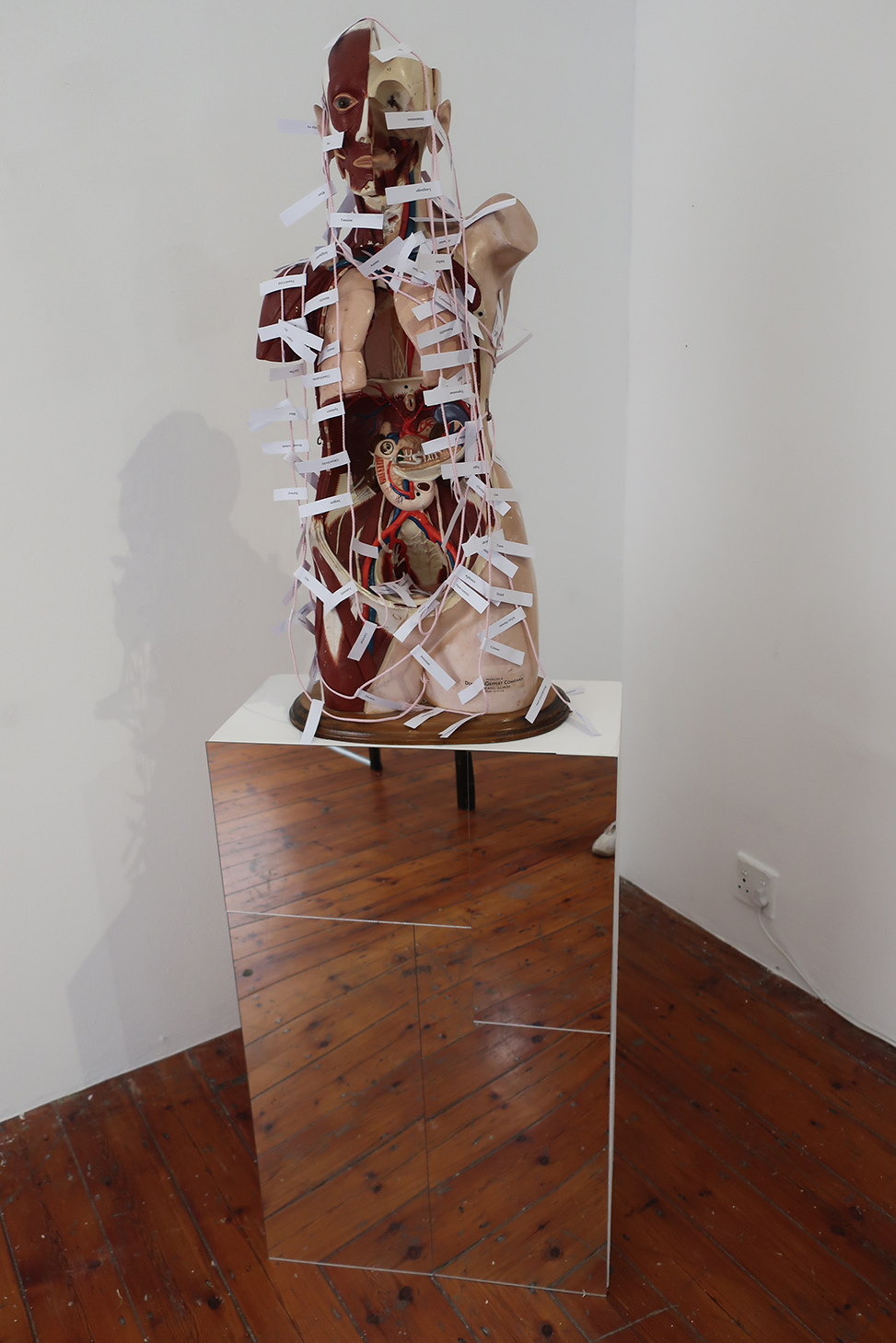 A curation by the Honours in Curatorship class of 2022 (Seth Kriger, Samuel Jordan, Voni Baloyi, Katlego Diseko, Gabriel Baard, Khumo Magano) using an educational anatomical bust as a prompt to think about everything except anatomy. Compiled along one string and draped over the bust, these associations create new relationships between the words and the object, as well as the different associative trajectories of each curator.