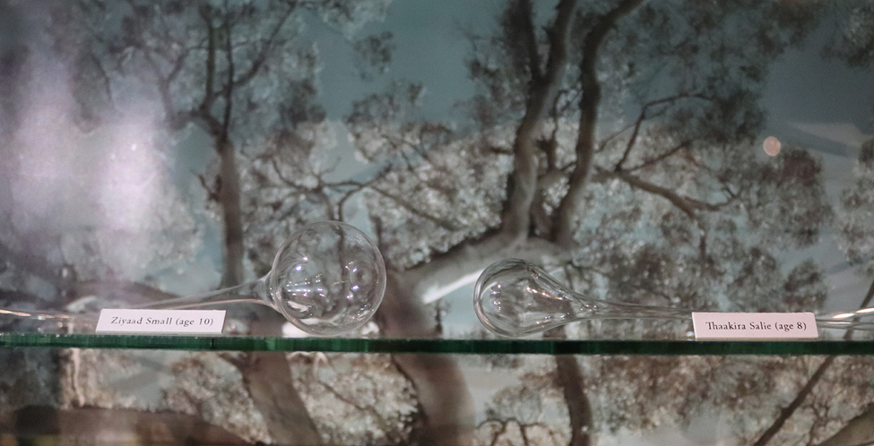 Four individual breaths of children suffering from asthma captured and sealed in glass: Thaakira Salie (age 8), Ziyaad Small (age 10), Blake Leppan (age 9) and Jessie Allot (age 11). The breaths sculptures were made in the UCT glass blowing workshop, with the assistance of Andre de Jager.