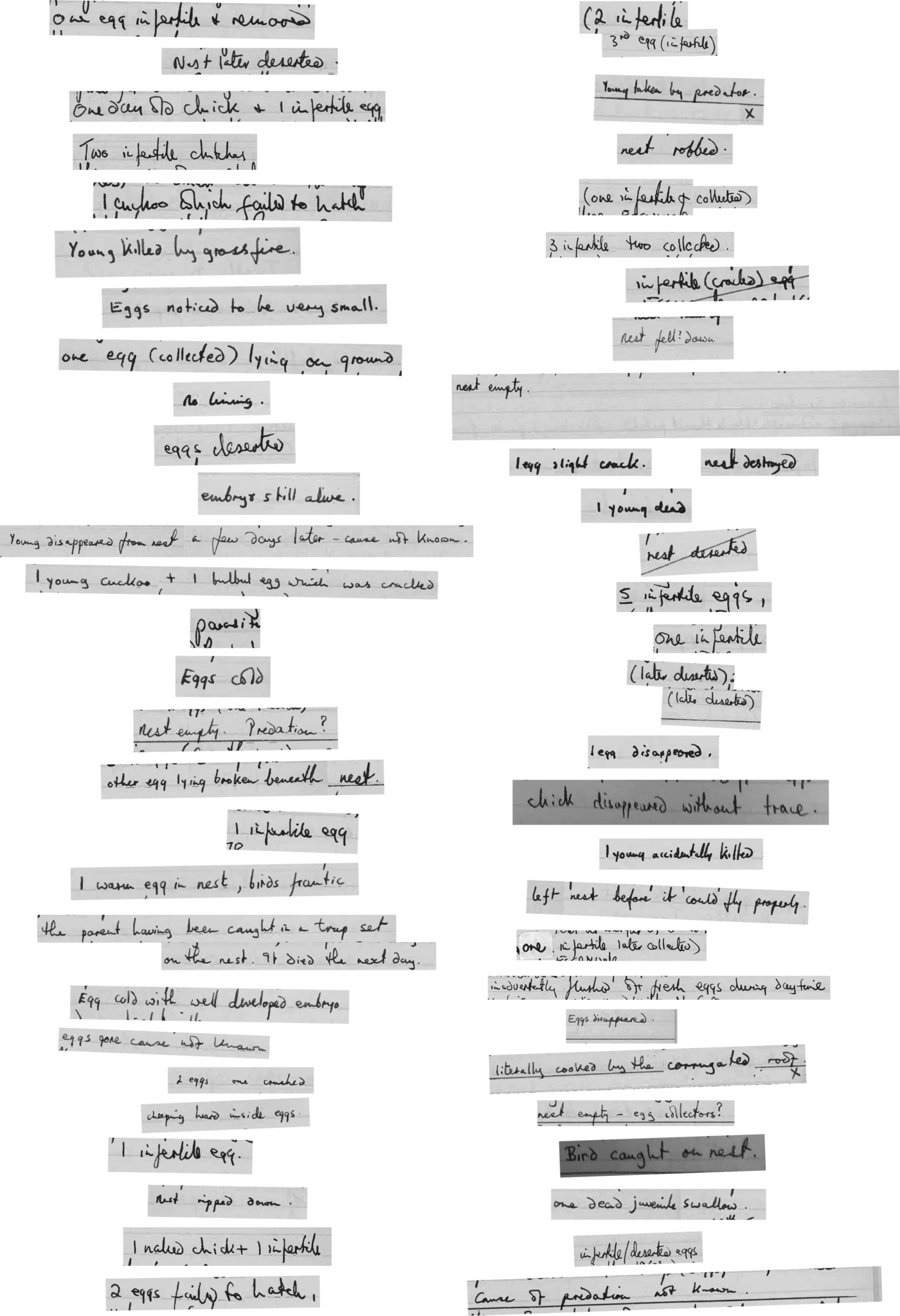 These lines are excerpts from individual entries in Notebook 2 - Nest Records. This notebook forms part of the Peter Steyn Collection of Eggs at the Department of Biological Sciences, UCT. These labelled and blown eggs were collected between 1961 and 1977 and are kept in a bespoke locked cabinet. The notebook records the birds’ breeding patterns and describes eggs-species, colour, dimensions, nest materiality, clutch, incubation and parenting styles with an evolving scientific vocabulary. These lines (or moments) extracted from the larger text speak however, of the complex and ruthless reproductive lives of birds, but also of the dichotomy of science and emotion – objectivity and subjectivities: "Eggs cold", "Nest empty", "Predation?", "Other egg laying broken beneath nest", "1 infertile egg", "The parent having been caught in a trap set on the nest. Died the next day", "Egg cold with well-developed embryo", "Eggs gone, cause not known", "2 eggs, one crushed"... Read as a list, they become comparative to notes made within maternity registers of South African hospitals – miscarriage, stillborn, teen pregnancy, NICU - and, as such, invite us to re-examine hierarchies of loss. Read Viruly’s full essay on the collection here.