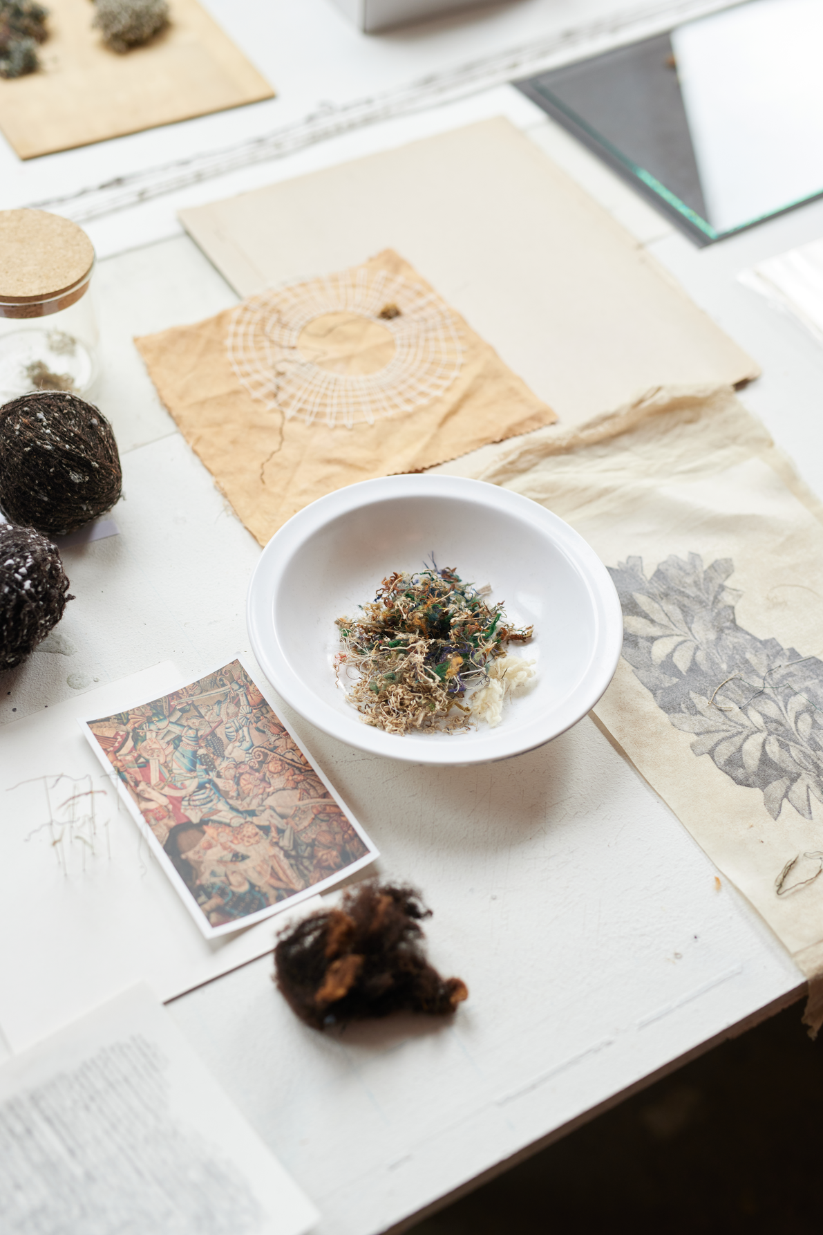 A multitude of sources nourished me during this project, and I thus thought it relevant to visualize each page of the article as a research table combining documents, archives, quotes from authors, samples of conservation fabric, studio views, and pictures of my works.