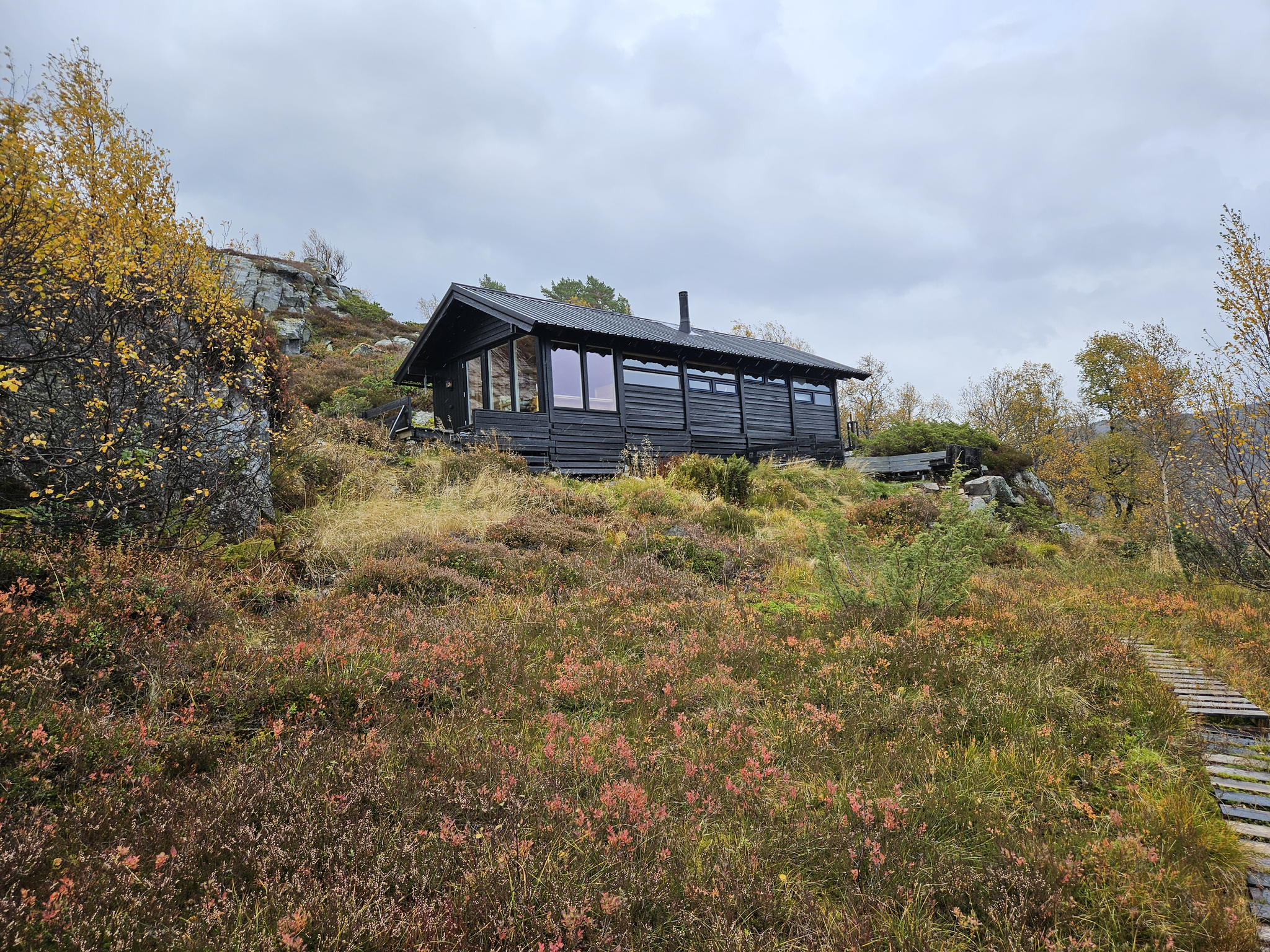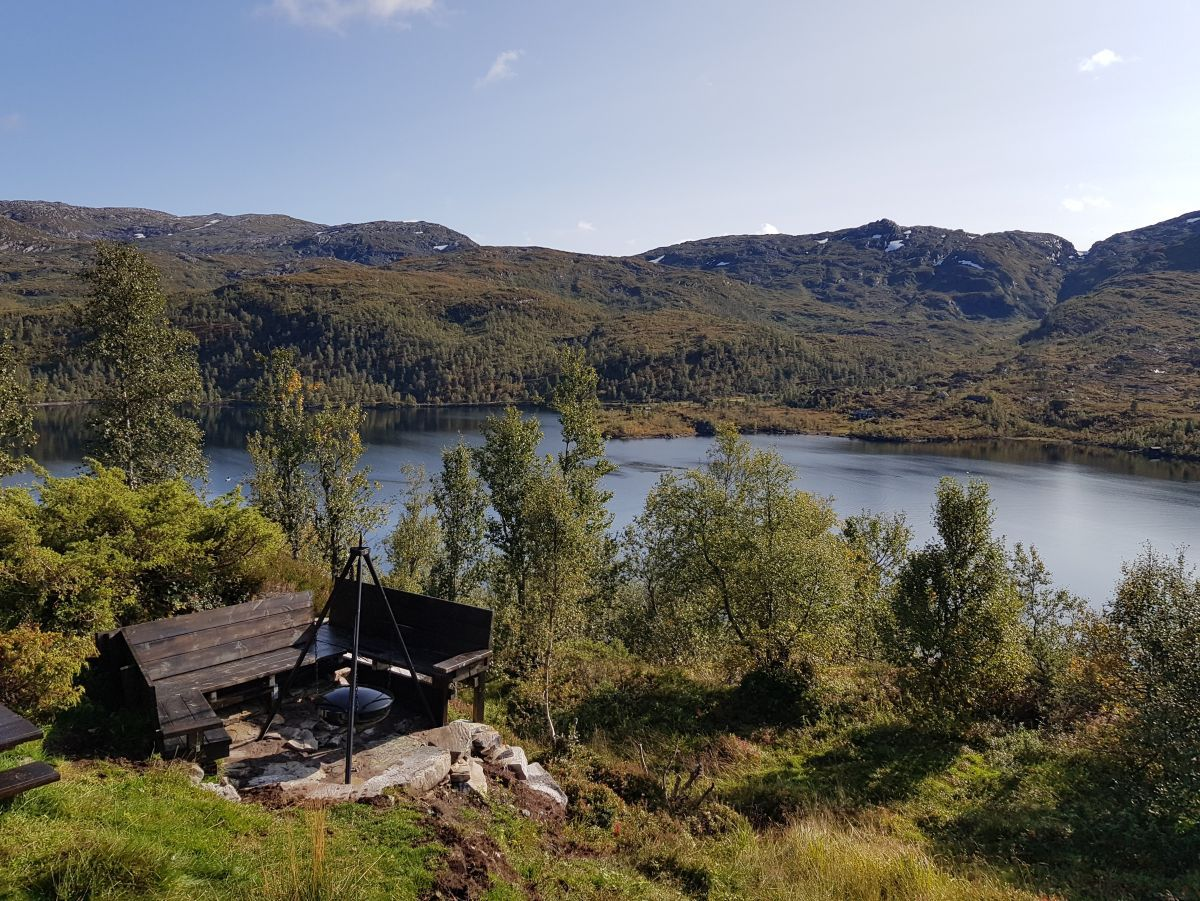 The day trip cabin in Voss is situated on Klepp (600 meters above sea level) on the north side of lake Vangsvatnet. The day trip cabin is free to use for everyone, all year round. Inside the cabin, you can warm up by the fireplace, and read books from the library. You may start the walk from Voss folkehøgskule.