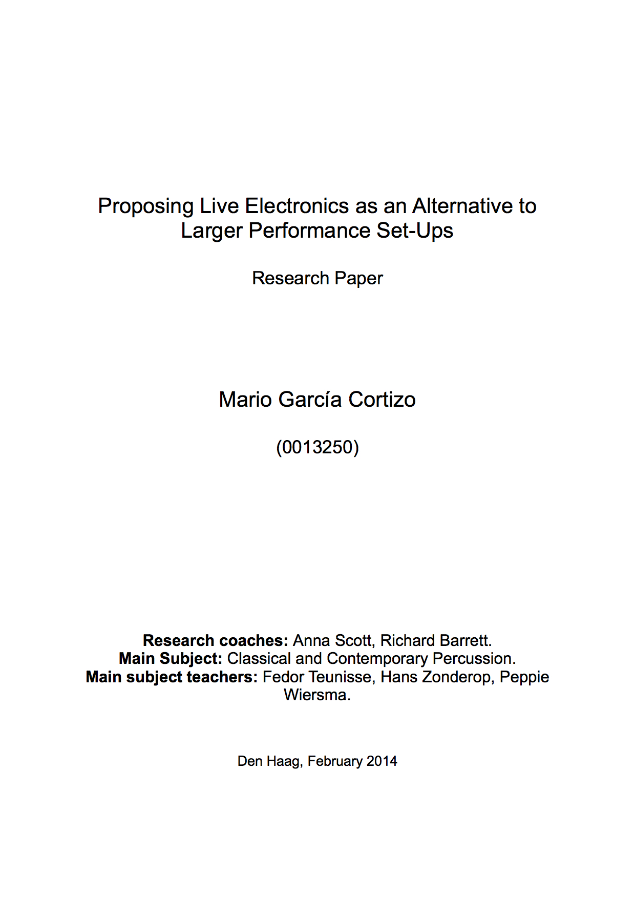 Name: Mario García Cortizo Main Subject: Classical and Contemporary Percussion Research Coaches: Anna Scott and Richard Barrett Title of Research: Proposing Live Electronics as an Alternative to Larger Performance Set-Ups Research Question: How can the inclusion of live electronics reduce required equipment while increasing performer efficiency? Research Process: After deciding on the topic of my research, I began reading and collecting all kinds of information related to the historical relationship between the arts and artists during major social and financial crises of the 20th Century. This included books, websites, journal and magazine articles, and museum exhibitions. In a practical sense, during the first year of the research process I was mainly focused on trying out different things by experimenting with live electronics both in improvised and concert music. For my second year, I have commissioned a new piece involving percussion and live electronics to be performed by composition student Siamak Anvari. I will also be the second person ever to play Hugo Morales’ piece 150pF, “for body capacitance and amplification system.” This piece involves a new instrument that I built myself, consisting of four jack connectors that are split into a four-channel system. As a complement for the program, I am doing a reduction of Frederic Rzewski’s Coming Together for one single player and an actress. Summary of Results: Throughout this text we have seen different proposals that have come out of limitations faced by artists during crisis periods: where creativity is forced to develop in very significant ways in order to keep creating pieces, performances - art that riches everybody, regardless of culture, politics, age, or other aspects. These limitations have provided artists with a lot of new instruments, technologies and techniques: tools that have helped composers and performers to develop new languages and frameworks within which to organize many different materials. Is very important to point out that the use of non-conventional instruments and live electronics can be considered when there are limitations, but we do not have to use these resources just because of the presence of a limitation, but rather as a part of an on-going research process that leads us to these resources as part of a particular creative solution. After going through all the practical examples experimented with and contained in this research, we can conclude that live electronics and non-conventional instruments are indeed an alternative to larger performance set-ups, not only when the economic situation is unfavorable, but even as a matter of taste.
