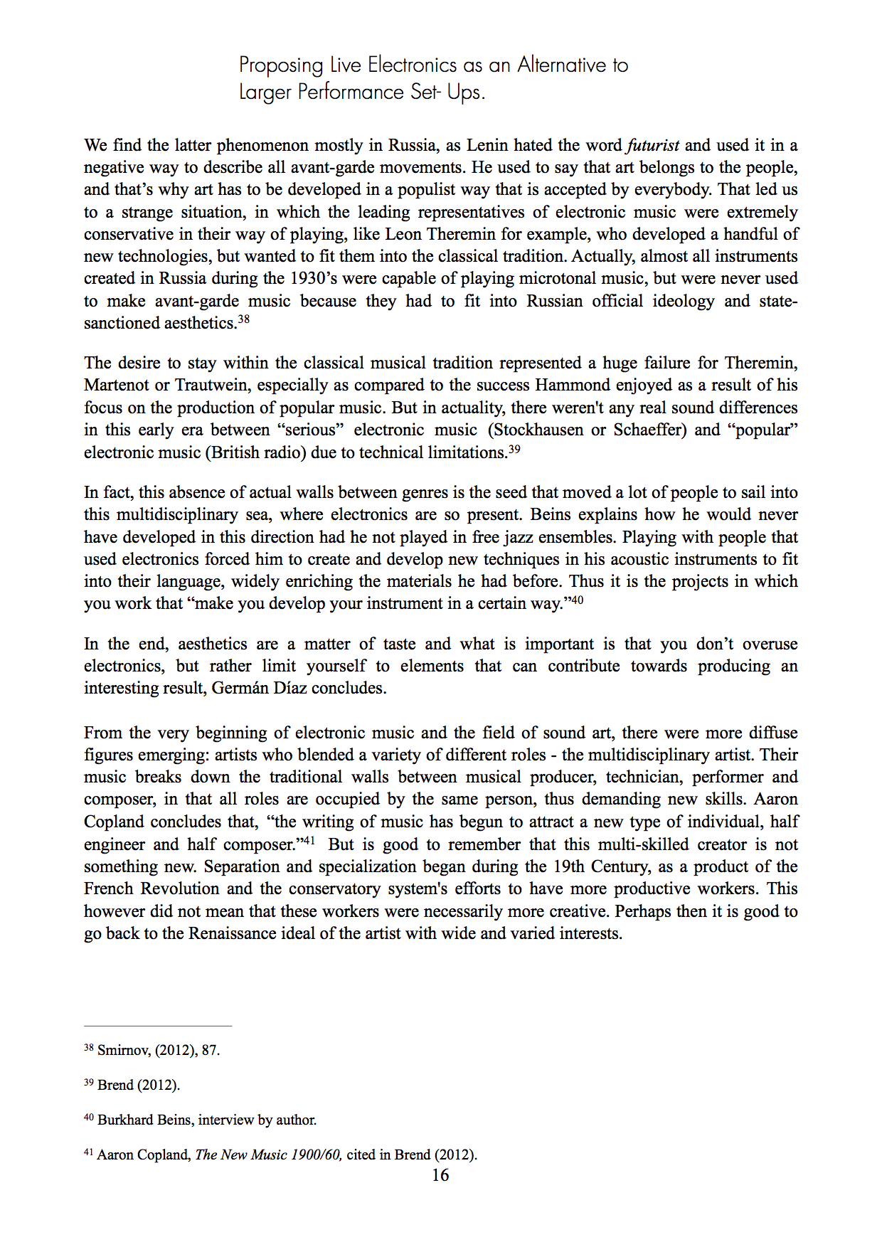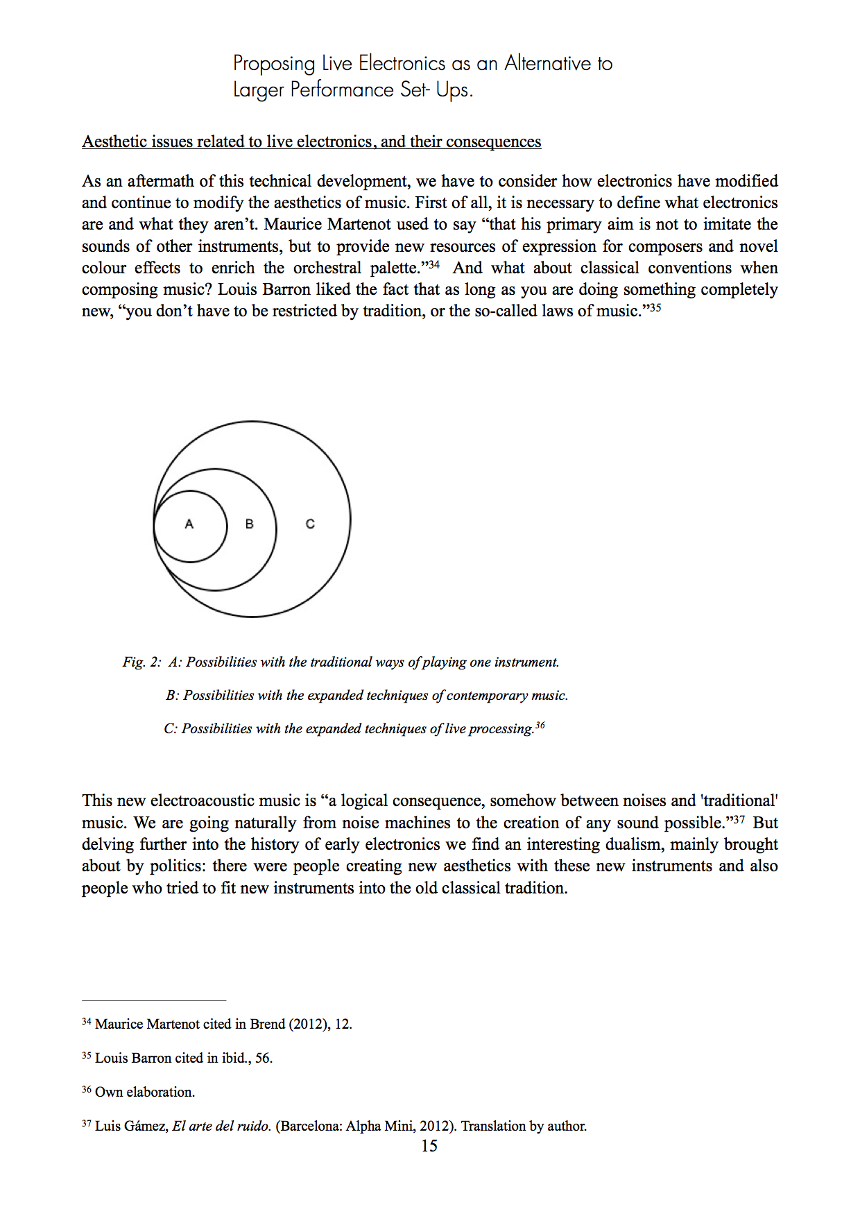 Name: Mario García Cortizo Main Subject: Classical and Contemporary Percussion Research Coaches: Anna Scott and Richard Barrett Title of Research: Proposing Live Electronics as an Alternative to Larger Performance Set-Ups Research Question: How can the inclusion of live electronics reduce required equipment while increasing performer efficiency? Research Process: After deciding on the topic of my research, I began reading and collecting all kinds of information related to the historical relationship between the arts and artists during major social and financial crises of the 20th Century. This included books, websites, journal and magazine articles, and museum exhibitions. In a practical sense, during the first year of the research process I was mainly focused on trying out different things by experimenting with live electronics both in improvised and concert music. For my second year, I have commissioned a new piece involving percussion and live electronics to be performed by composition student Siamak Anvari. I will also be the second person ever to play Hugo Morales’ piece 150pF, “for body capacitance and amplification system.” This piece involves a new instrument that I built myself, consisting of four jack connectors that are split into a four-channel system. As a complement for the program, I am doing a reduction of Frederic Rzewski’s Coming Together for one single player and an actress. Summary of Results: Throughout this text we have seen different proposals that have come out of limitations faced by artists during crisis periods: where creativity is forced to develop in very significant ways in order to keep creating pieces, performances - art that riches everybody, regardless of culture, politics, age, or other aspects. These limitations have provided artists with a lot of new instruments, technologies and techniques: tools that have helped composers and performers to develop new languages and frameworks within which to organize many different materials. Is very important to point out that the use of non-conventional instruments and live electronics can be considered when there are limitations, but we do not have to use these resources just because of the presence of a limitation, but rather as a part of an on-going research process that leads us to these resources as part of a particular creative solution. After going through all the practical examples experimented with and contained in this research, we can conclude that live electronics and non-conventional instruments are indeed an alternative to larger performance set-ups, not only when the economic situation is unfavorable, but even as a matter of taste.