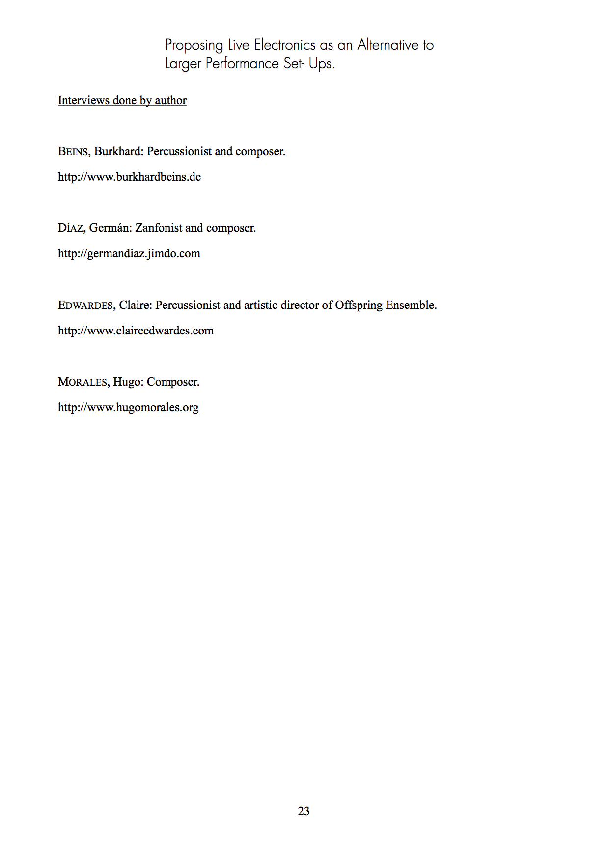 Name: Mario García Cortizo Main Subject: Classical and Contemporary Percussion Research Coaches: Anna Scott and Richard Barrett Title of Research: Proposing Live Electronics as an Alternative to Larger Performance Set-Ups Research Question: How can the inclusion of live electronics reduce required equipment while increasing performer efficiency? Research Process: After deciding on the topic of my research, I began reading and collecting all kinds of information related to the historical relationship between the arts and artists during major social and financial crises of the 20th Century. This included books, websites, journal and magazine articles, and museum exhibitions. In a practical sense, during the first year of the research process I was mainly focused on trying out different things by experimenting with live electronics both in improvised and concert music. For my second year, I have commissioned a new piece involving percussion and live electronics to be performed by composition student Siamak Anvari. I will also be the second person ever to play Hugo Morales’ piece 150pF, “for body capacitance and amplification system.” This piece involves a new instrument that I built myself, consisting of four jack connectors that are split into a four-channel system. As a complement for the program, I am doing a reduction of Frederic Rzewski’s Coming Together for one single player and an actress. Summary of Results: Throughout this text we have seen different proposals that have come out of limitations faced by artists during crisis periods: where creativity is forced to develop in very significant ways in order to keep creating pieces, performances - art that riches everybody, regardless of culture, politics, age, or other aspects. These limitations have provided artists with a lot of new instruments, technologies and techniques: tools that have helped composers and performers to develop new languages and frameworks within which to organize many different materials. Is very important to point out that the use of non-conventional instruments and live electronics can be considered when there are limitations, but we do not have to use these resources just because of the presence of a limitation, but rather as a part of an on-going research process that leads us to these resources as part of a particular creative solution. After going through all the practical examples experimented with and contained in this research, we can conclude that live electronics and non-conventional instruments are indeed an alternative to larger performance set-ups, not only when the economic situation is unfavorable, but even as a matter of taste.