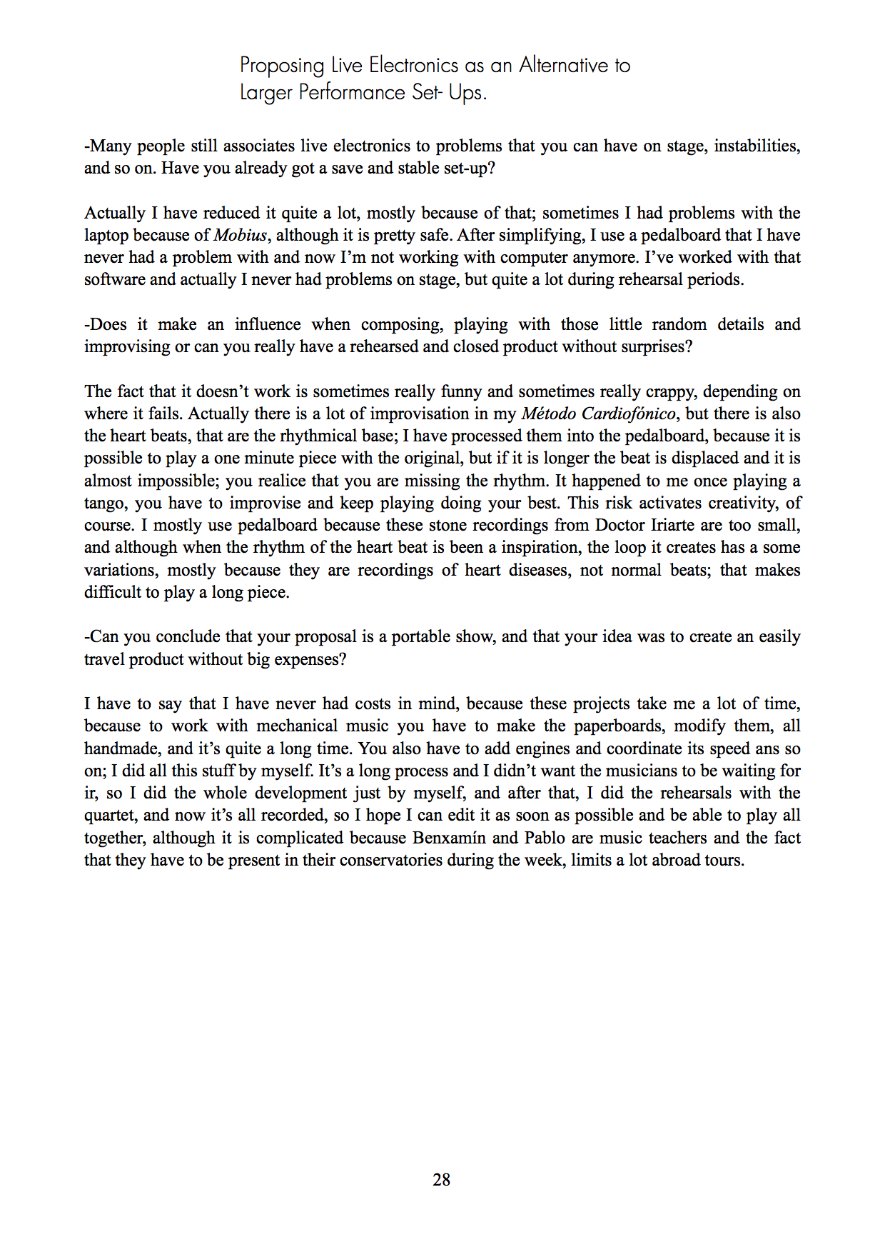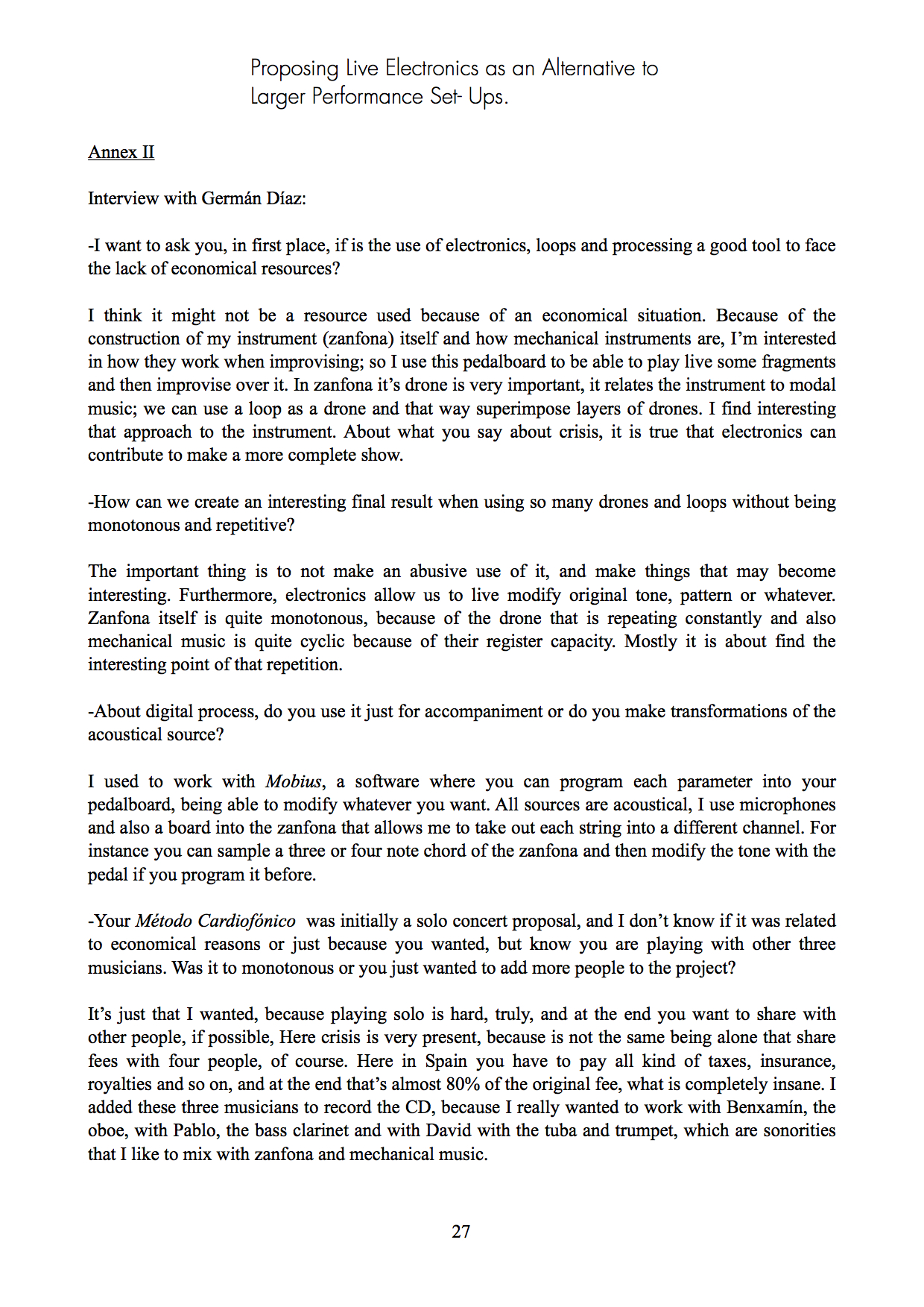 Name: Mario García Cortizo Main Subject: Classical and Contemporary Percussion Research Coaches: Anna Scott and Richard Barrett Title of Research: Proposing Live Electronics as an Alternative to Larger Performance Set-Ups Research Question: How can the inclusion of live electronics reduce required equipment while increasing performer efficiency? Research Process: After deciding on the topic of my research, I began reading and collecting all kinds of information related to the historical relationship between the arts and artists during major social and financial crises of the 20th Century. This included books, websites, journal and magazine articles, and museum exhibitions. In a practical sense, during the first year of the research process I was mainly focused on trying out different things by experimenting with live electronics both in improvised and concert music. For my second year, I have commissioned a new piece involving percussion and live electronics to be performed by composition student Siamak Anvari. I will also be the second person ever to play Hugo Morales’ piece 150pF, “for body capacitance and amplification system.” This piece involves a new instrument that I built myself, consisting of four jack connectors that are split into a four-channel system. As a complement for the program, I am doing a reduction of Frederic Rzewski’s Coming Together for one single player and an actress. Summary of Results: Throughout this text we have seen different proposals that have come out of limitations faced by artists during crisis periods: where creativity is forced to develop in very significant ways in order to keep creating pieces, performances - art that riches everybody, regardless of culture, politics, age, or other aspects. These limitations have provided artists with a lot of new instruments, technologies and techniques: tools that have helped composers and performers to develop new languages and frameworks within which to organize many different materials. Is very important to point out that the use of non-conventional instruments and live electronics can be considered when there are limitations, but we do not have to use these resources just because of the presence of a limitation, but rather as a part of an on-going research process that leads us to these resources as part of a particular creative solution. After going through all the practical examples experimented with and contained in this research, we can conclude that live electronics and non-conventional instruments are indeed an alternative to larger performance set-ups, not only when the economic situation is unfavorable, but even as a matter of taste.