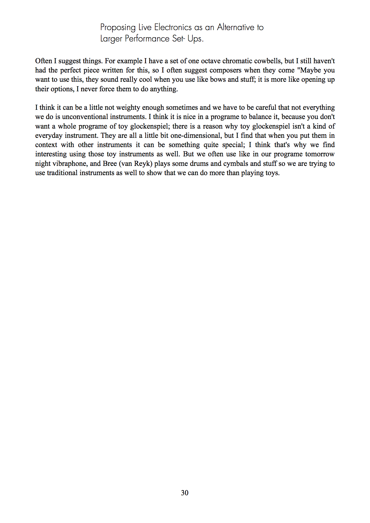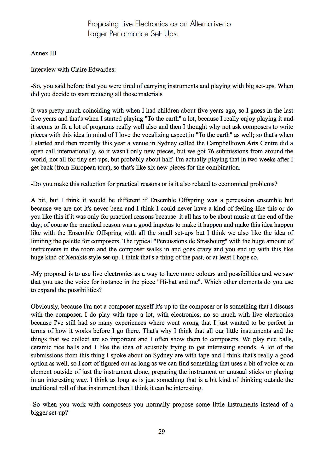 Name: Mario García Cortizo Main Subject: Classical and Contemporary Percussion Research Coaches: Anna Scott and Richard Barrett Title of Research: Proposing Live Electronics as an Alternative to Larger Performance Set-Ups Research Question: How can the inclusion of live electronics reduce required equipment while increasing performer efficiency? Research Process: After deciding on the topic of my research, I began reading and collecting all kinds of information related to the historical relationship between the arts and artists during major social and financial crises of the 20th Century. This included books, websites, journal and magazine articles, and museum exhibitions. In a practical sense, during the first year of the research process I was mainly focused on trying out different things by experimenting with live electronics both in improvised and concert music. For my second year, I have commissioned a new piece involving percussion and live electronics to be performed by composition student Siamak Anvari. I will also be the second person ever to play Hugo Morales’ piece 150pF, “for body capacitance and amplification system.” This piece involves a new instrument that I built myself, consisting of four jack connectors that are split into a four-channel system. As a complement for the program, I am doing a reduction of Frederic Rzewski’s Coming Together for one single player and an actress. Summary of Results: Throughout this text we have seen different proposals that have come out of limitations faced by artists during crisis periods: where creativity is forced to develop in very significant ways in order to keep creating pieces, performances - art that riches everybody, regardless of culture, politics, age, or other aspects. These limitations have provided artists with a lot of new instruments, technologies and techniques: tools that have helped composers and performers to develop new languages and frameworks within which to organize many different materials. Is very important to point out that the use of non-conventional instruments and live electronics can be considered when there are limitations, but we do not have to use these resources just because of the presence of a limitation, but rather as a part of an on-going research process that leads us to these resources as part of a particular creative solution. After going through all the practical examples experimented with and contained in this research, we can conclude that live electronics and non-conventional instruments are indeed an alternative to larger performance set-ups, not only when the economic situation is unfavorable, but even as a matter of taste.