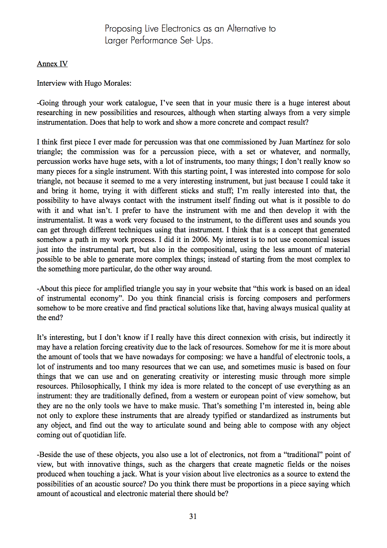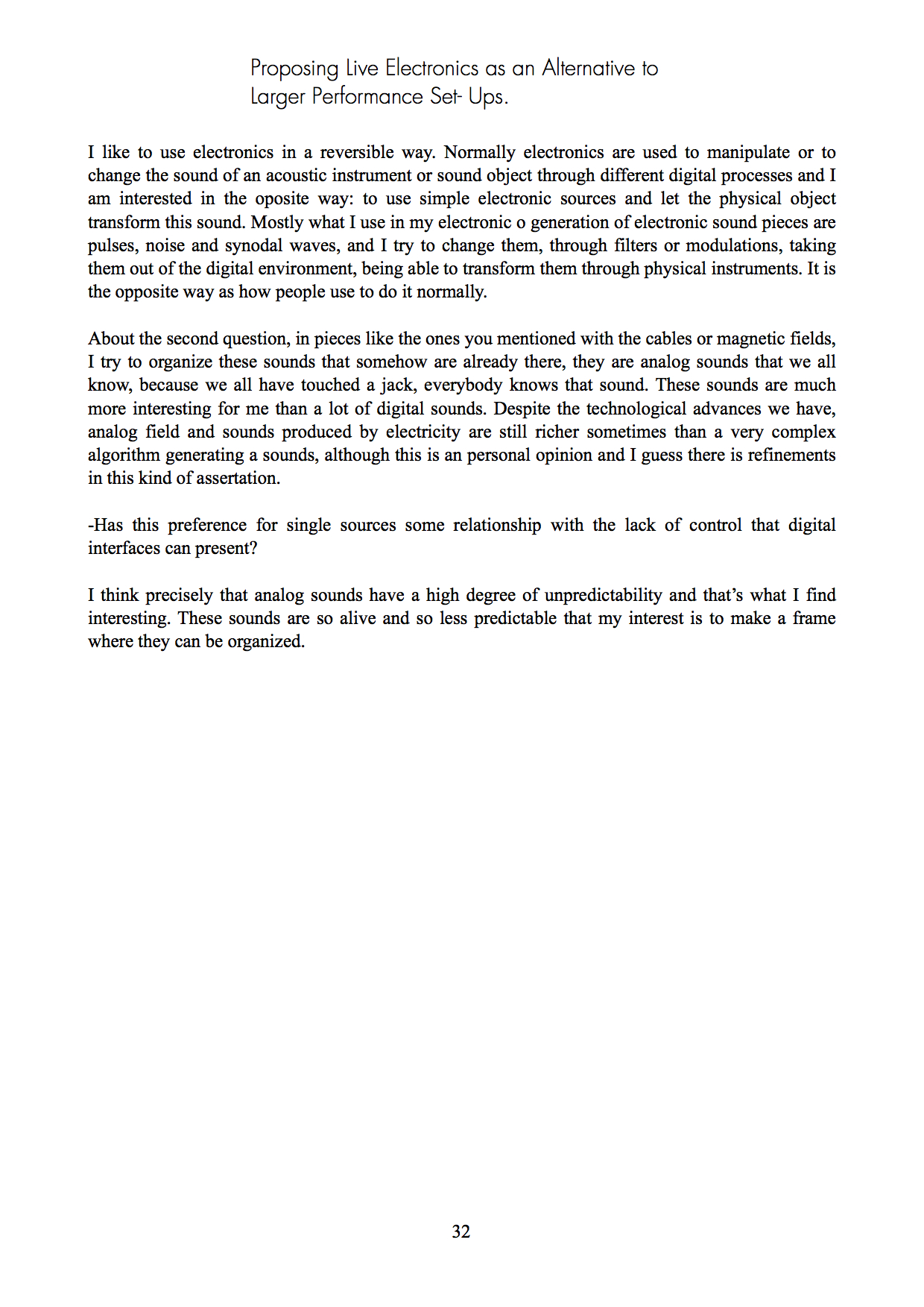 Name: Mario García Cortizo Main Subject: Classical and Contemporary Percussion Research Coaches: Anna Scott and Richard Barrett Title of Research: Proposing Live Electronics as an Alternative to Larger Performance Set-Ups Research Question: How can the inclusion of live electronics reduce required equipment while increasing performer efficiency? Research Process: After deciding on the topic of my research, I began reading and collecting all kinds of information related to the historical relationship between the arts and artists during major social and financial crises of the 20th Century. This included books, websites, journal and magazine articles, and museum exhibitions. In a practical sense, during the first year of the research process I was mainly focused on trying out different things by experimenting with live electronics both in improvised and concert music. For my second year, I have commissioned a new piece involving percussion and live electronics to be performed by composition student Siamak Anvari. I will also be the second person ever to play Hugo Morales’ piece 150pF, “for body capacitance and amplification system.” This piece involves a new instrument that I built myself, consisting of four jack connectors that are split into a four-channel system. As a complement for the program, I am doing a reduction of Frederic Rzewski’s Coming Together for one single player and an actress. Summary of Results: Throughout this text we have seen different proposals that have come out of limitations faced by artists during crisis periods: where creativity is forced to develop in very significant ways in order to keep creating pieces, performances - art that riches everybody, regardless of culture, politics, age, or other aspects. These limitations have provided artists with a lot of new instruments, technologies and techniques: tools that have helped composers and performers to develop new languages and frameworks within which to organize many different materials. Is very important to point out that the use of non-conventional instruments and live electronics can be considered when there are limitations, but we do not have to use these resources just because of the presence of a limitation, but rather as a part of an on-going research process that leads us to these resources as part of a particular creative solution. After going through all the practical examples experimented with and contained in this research, we can conclude that live electronics and non-conventional instruments are indeed an alternative to larger performance set-ups, not only when the economic situation is unfavorable, but even as a matter of taste.