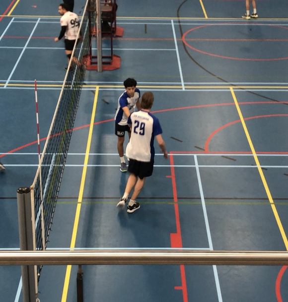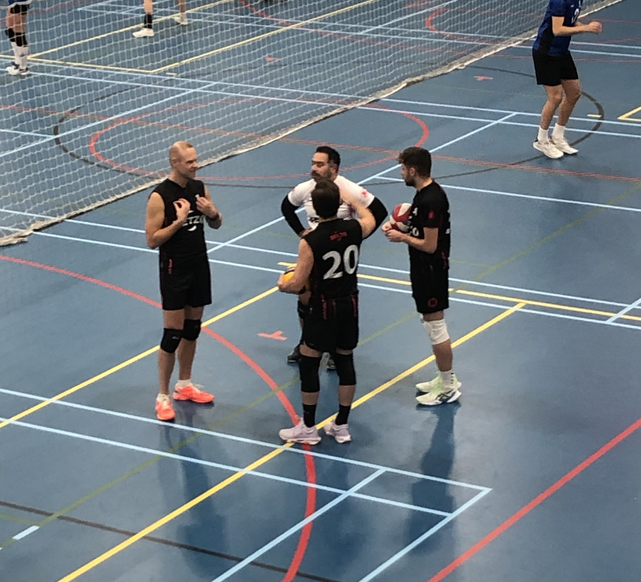 Opmerkingen: De sfeer al anders dan bij de training. Spelers lijken meer gespannen, en bij fouten zijn de reacties net iets intenser. Eén speler die de bal verkeerd aanspeelde naar de setter, excuseert zich herhaaldelijk tegenover teamgenoten. Een ander is zichtbaar geïrriteerd nadat hij de bal in het net sloeg en niet er over heen. Wel merk je dat het team elkaar meer aan het steunen is. Ze geven complimenten wanneer iets goed gaat.