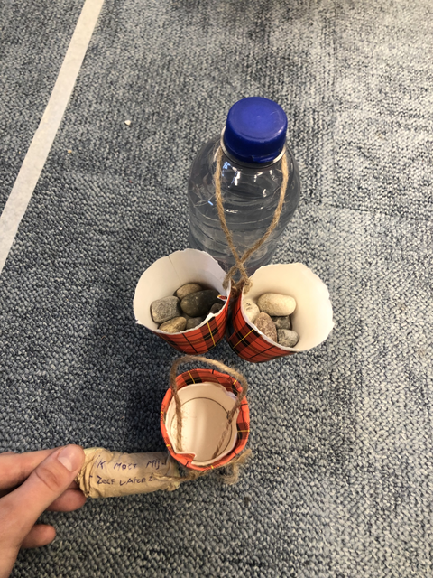 Tijdens een van de lessen gingen wij een installatie wat past bij ons onderzoek. Nadat ik had gedacht welke materialen ik ter beschikking had kwam ik op een idee. Ik pakte wat steentjes, een stuk touw, papier en een takje. Van het papiertje maakte ik een soort kommetje. Dit knoopte ik vast met het touw aan de kleine breekbare tak. Het takje plakte ik vast aan een oppervlakte zodat het omhoog stak.