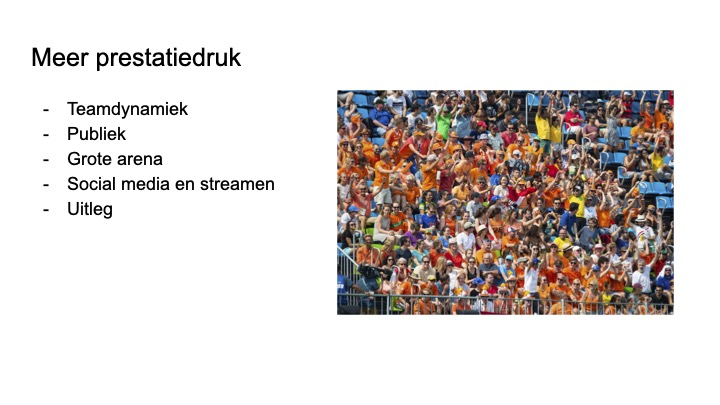 Door het teamdynamiek zijn er betere en mindere sporters. Wellicht voelen ze daardoor meer druk om te presteren. Ook wordt het ge livestreamt dus iedereen die je kent is waarschijnlijk aan het mee kijken. Dit is allemaal als doel om deze doelgroep de gevolgen van prestatiedruk laten voelen.
