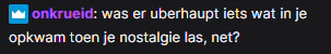 Omdat ik niet te opdringerig wil zijn, heb ik meegedaan met het gesprek voor de 20-30 minuten die volgden. In eerste instantie voelde dat misschien als zonde van mijn tijd. Maar dit is ook oke. Je kan niet verwachten dat je 2 uur lang een discourse over nostalgie kan observeren (tenzij je een interview met iemand aflegt, en dat beide partijen hier dus voorbereid op zijn).