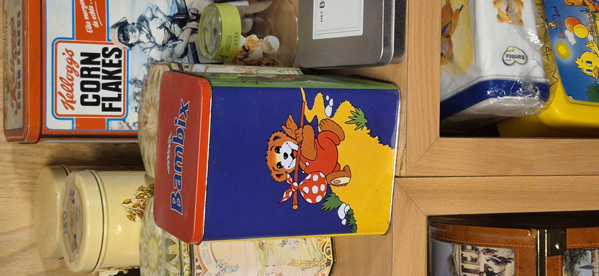 Er is ook een zolder in het C1000 museum met dus een blikkenverzameling, oude grootgrutter artikelen, en interne documenten van C1000. Daar kwam ik deze Bambix blik tegen.