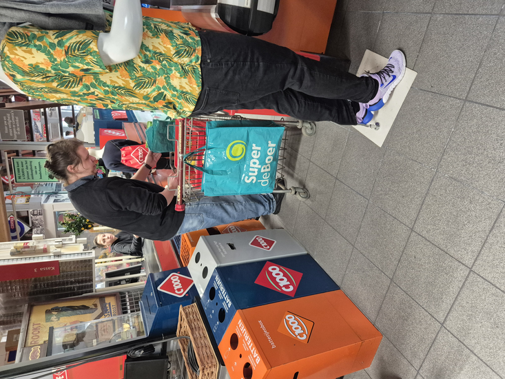 Eens in de 15-30 minuten hoor je vanuit de andere kant van de stal "KASSA 3 is GEOPEND". Ze willen dan ook eigenlijk dat er werkelijk mensen langskomen, lege verpakkingen pakken en op de (werkende) lopende band leggen. De jongen doet dan de producten 'scannen', en ik kan dan vervolgens met 'pin' betalen (door een visitiekaartje in de pinapparaat te stoppen en geluidjes te maken).