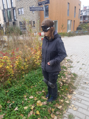 Dit heb ik gedaan door geblinddoekt en met oordopjes in, mijn omgeving te ervaren. Eerst heb ik een beetje rondgewandeld en op de tast mijn omgeving verkend. Daarna heb ik dit kruipend gedaan en ook tijgerend.