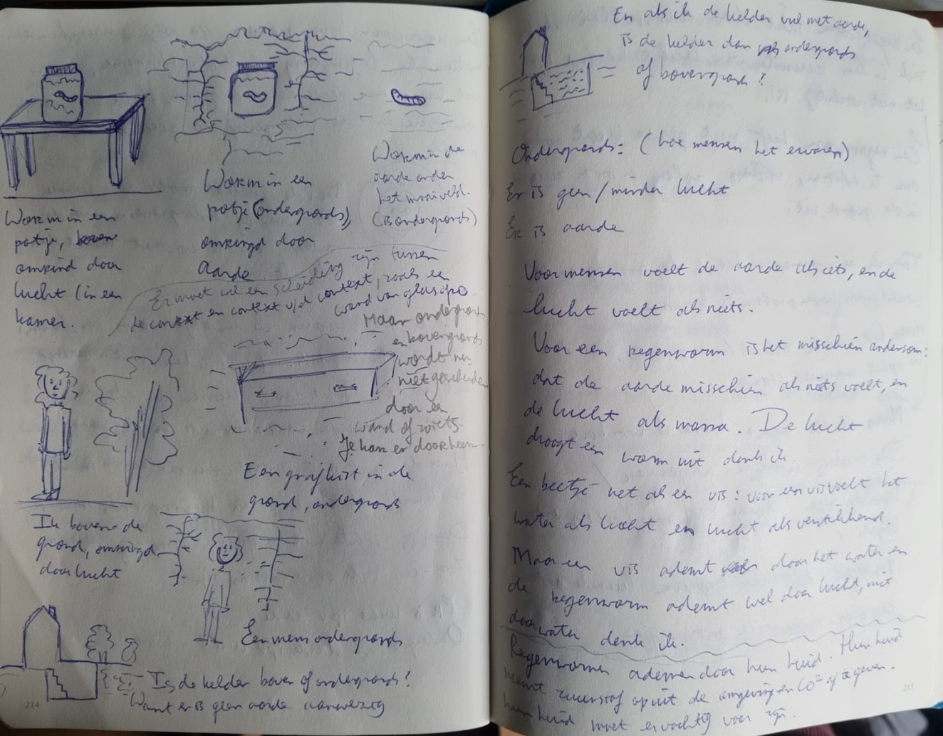 Toen ik meer ging nadenken over de overeenkomsten en verschillen tussen ondergronds en bovengronds, begon ik mij af te vragen ofdat regenwormen de aarde ook heel anders ervaren dan hoe wij dat doen. De lucht droogt ze uit, dus misschien voelt dat meer verstikkend voor ze. Toch hebben ze ook lucht nodig om te ademen. Zijn de verschillen dan heel groot, of valt het wel mee?