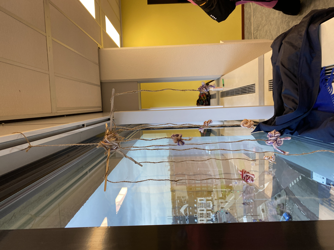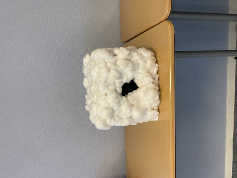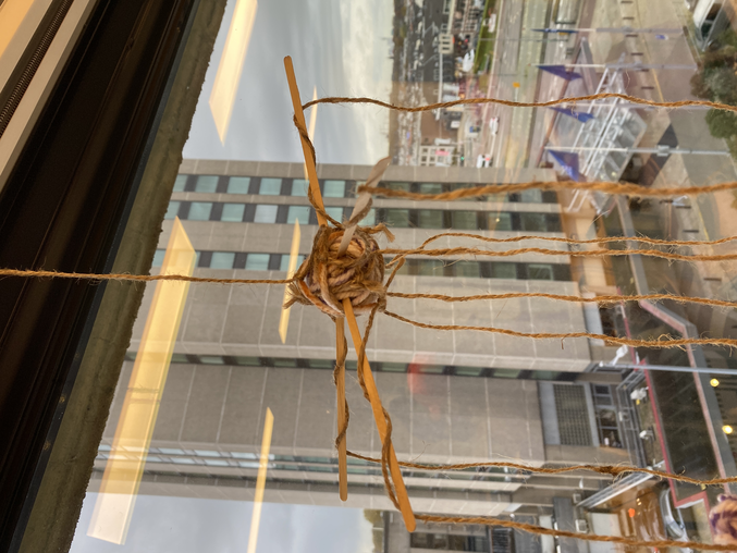 Visualisatie les waarin we een uur de tijd kregen om vanuit een materiaal te werken dat iets zegt over jouw onderzoek. Hierbij heb ik van touw en garen een verbindspin gemaakt. De grote bol in het midden is de kern die staat voor dat we allemaal de behoefte hebben aan acceptatie, erkenning en empathie. Maar daaronder is het garen toch van elkaar gescheiden op kleur, omdat het aansluiten op deze behoefte wél kan verschillen per persoon (per achtergrond). De verbinding van de kern naar de losse kleuren bolletjes is van tauw om de bewustwording van de kracht van deze verbinding aan te wakkeren.