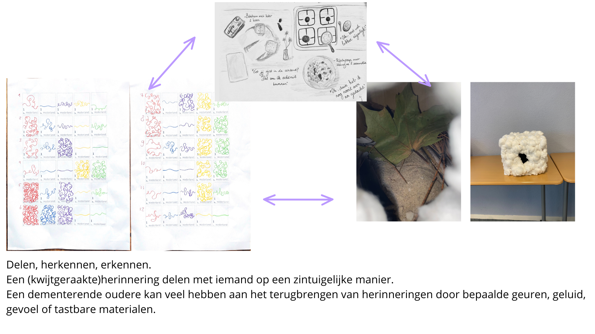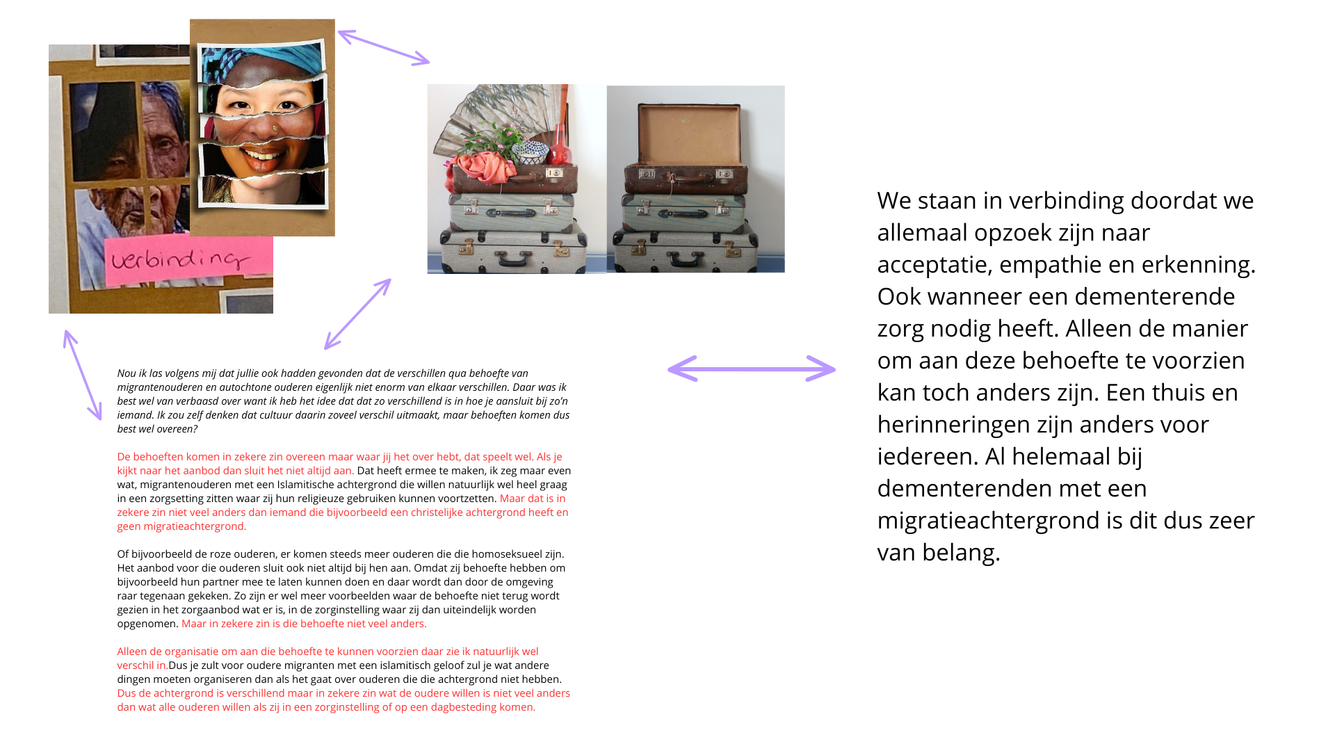 De behoefte aan zorg (erkenning, herinneringen, warmte,thuis) is er voor iedereen. Ook ongeacht afkomst. Echter, hoe we in deze behoefte voorzien is wél verschillend. Iedereen zijn interpretatie kan anders zijn. Ik wil het dus omdraaien. Niet focussen op één specifieke herinnering van iemand, maar laten zien hoeveel verschillende associaties en herinneringen ieder mens heeft bij bepaalde elementen. Net zoals de voeldoos in de visualisatie les. Hier zag je dat bij het voelen van de elementen en de geuren iedereen zijn eigen herinneringen heeft. Dit kan ik verder doortrekken naar andere zintuiglijke elementen. “De koffer” wordt dan niet alleen leger maar wordt ook weer bijgevuld.