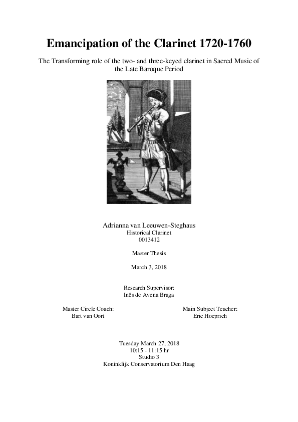 Name: Adrianna van Leeuwen-Steghaus Main Subject: Historical Clarinet Research Supervisor: Inês de Avena Braga Title of Research: Emancipation of the Clarinet 1720-1760 The transforming role of the two and three keyed clarinet in Sacred Music of the Late Baroque Period Research Question: Can we trace the Baroque Clarinet's role in Sacred Music and is there an obvious progression in the way composers wrote for the instrument beginning in the early 18th century to the instruments demise in the mid 18th century? What was the Baroque Clarinet's role in Sacred Music? Did composers intentioanlly use this instrument and if so for what purpose? Summary of Results: When speaking about the clarinet, the first period of music we naturally associate with it is the Classical. However, few realise that the history of the clarinet begins much earlier in the Baroque, with an instrument that we would today describe as ‘primitive’. The Baroque clarinet was developed around 1700 in Germany. It's repertoire and legacy is confined to about 50 years of music history. Colloquially called the 'Mock Trumpet', the Baroque Clarinet is characterized by a bright and brilliant sound. Some research has been done on the instrument already, particularily on its general history and repertoire. However what remains missing is uncovering the Baroque Clarinet's role in sacred music. Sacred music, particularily cantatas dominated musical life in the 18th century. Cantatas were performed every Sunday as well as on special feasts throughout the ecclesiastical calendar. Over the past two years, I have discovered a trove of cantatas containing parts specifically written for the Baroque Clarinet, some by well-known composers such as Telemann and Graupner and others unknown until now, such as Seibert and Kurz. Coincidentally, most of the composers are of German origin, employed by various cities and/or courts across the German-speaking lands. This research examines the repertoire and attempts to find a progression in the clarinet's use and role. The instruments characteristic timbre meant it shared a symbiotic relationship with the trumpet, but did it ever shed its trumpet association and find its own voice? Through analysis of the various cantata parts, I uncover that the clarinet was in some ways the 'perfect compromise'; able to sound brassy and brilliant when required, while also able to produce a sweet and singing tone. The clarinet was also techinically more capable then its trumpet counterpart, because it was less confined to the harmonic series and able to play quicker notes melodically with more stepwise intervals. In November 2017, the Royal Consrvatorie's Early Music Department premiered two of Telemann's cantatas with clarient parts; Lobet den Herrn TWV 1:1061 and Der Tod ist verschlungen in den Sieg TWV 1:320. Biography: Adrianna van Leeuwen-Steghaus, is a Canadian clarinettist specialising in historical instrument performance. She is a member of two successful chamber ensembles, the Swedish based trio Boxwood & Bows and the Dutch based duo The Küffner Gals. Adrianna graduated with distinction from the University Of Calgary (CAN), obtaining her Bachelor’s degree in modern clarinet performance. She moved to the Netherlands in 2012, to complete a second Bachelor’s degree in Historical Clarinet and Chalumeaux at the Koninklijk Conservatorium in Den Haag. Currently, she is busy completing her Master’s degree and thesis under the tutelage of Professor Eric Hoeprich in the Netherlands.