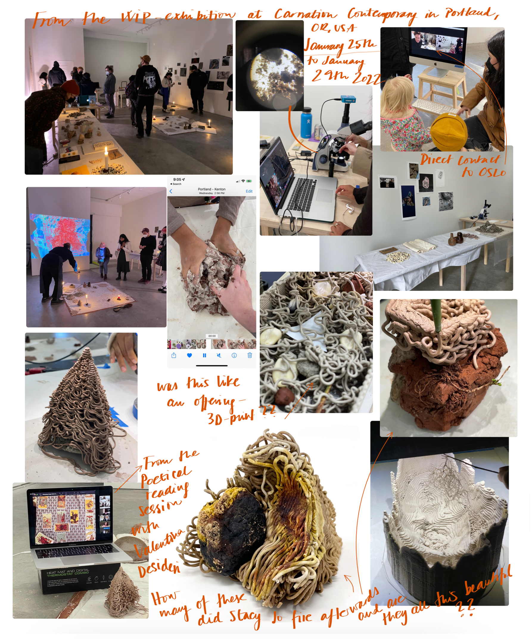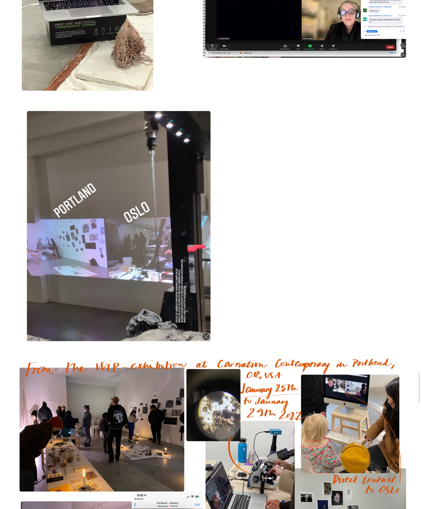 I januar 2022 dro Arely til Eugene for å arbeide sammen med Stacy Jo til en arbeidende utstilling på Carnation Contemporary i Portland, Oregon. Samtidig hadde jeg en arbeidende utstilling som en del av ROM studio på ROM for kunst og arkitektur i Oslo. Vi brukte samme metode som før der vi samarbeidet og utvekslet digitale og fysiske prosesser, men nå i to gallerirom på to kontinenter på tvers av tidssoner. Vi viste også arbeider og ideer gjennom den digitale plattformen SUERO i Peru.
