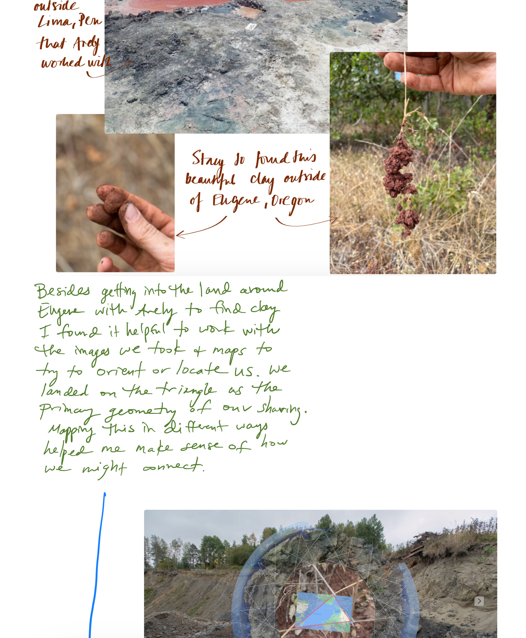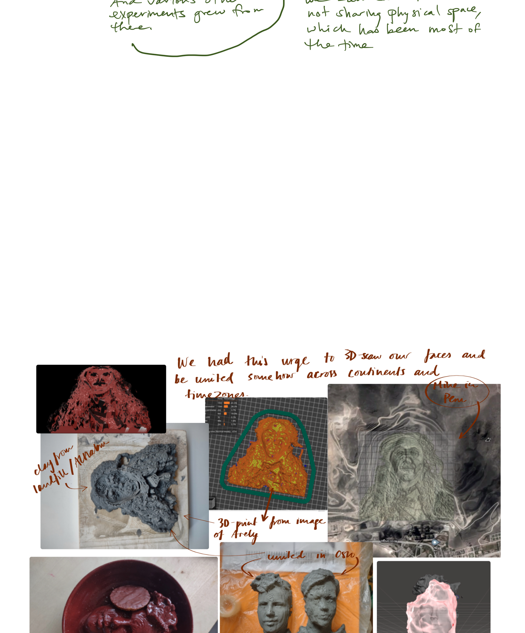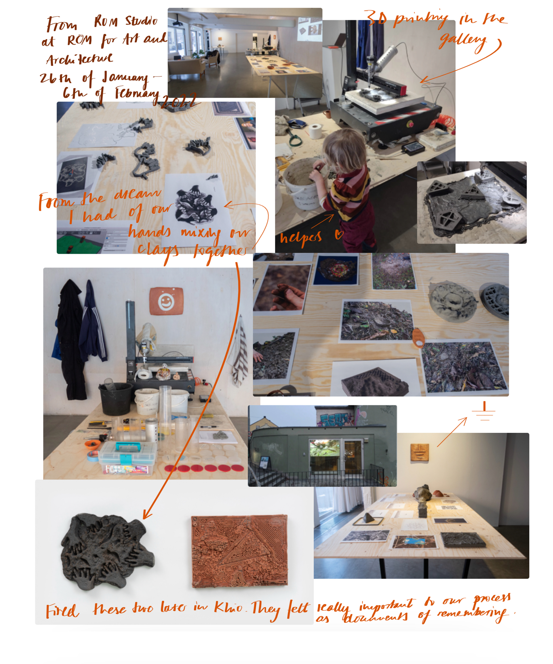 Til høyre: 2,5x23,5x21 cm, 3D-printet, brent blåleire fra Feiring Bruk, avdeling Kulmoen, originalt fra Breivollveien 25C, Alnabru, Oslo. Objektet er dekket av rå leire fra samme sted i form av en terra sigillata. 3D-printen er basert på en tegning fra en drøm jeg hadde under min, Stacy Jo og Arely´s samarbeidsperiode i ROM studio/ Carnation Contemporary i januar 2022. Arely hadde reist til Oregon for å møte Stacy Jo for første gang. De sendte over et bilde der de blandet leire fra Lima sammen med leire fra Eugene med hendene sine. I drømmen min var alle henda våre i samme klump med leire som var en blanding av leire fra Eugene, Oslo og Lima. Da jeg våknet opp, tegnet jeg tegningen. Tegningen er oversatt av programvaren Cura fra flatt bilde til et relieff basert på mørke og lyse farger.