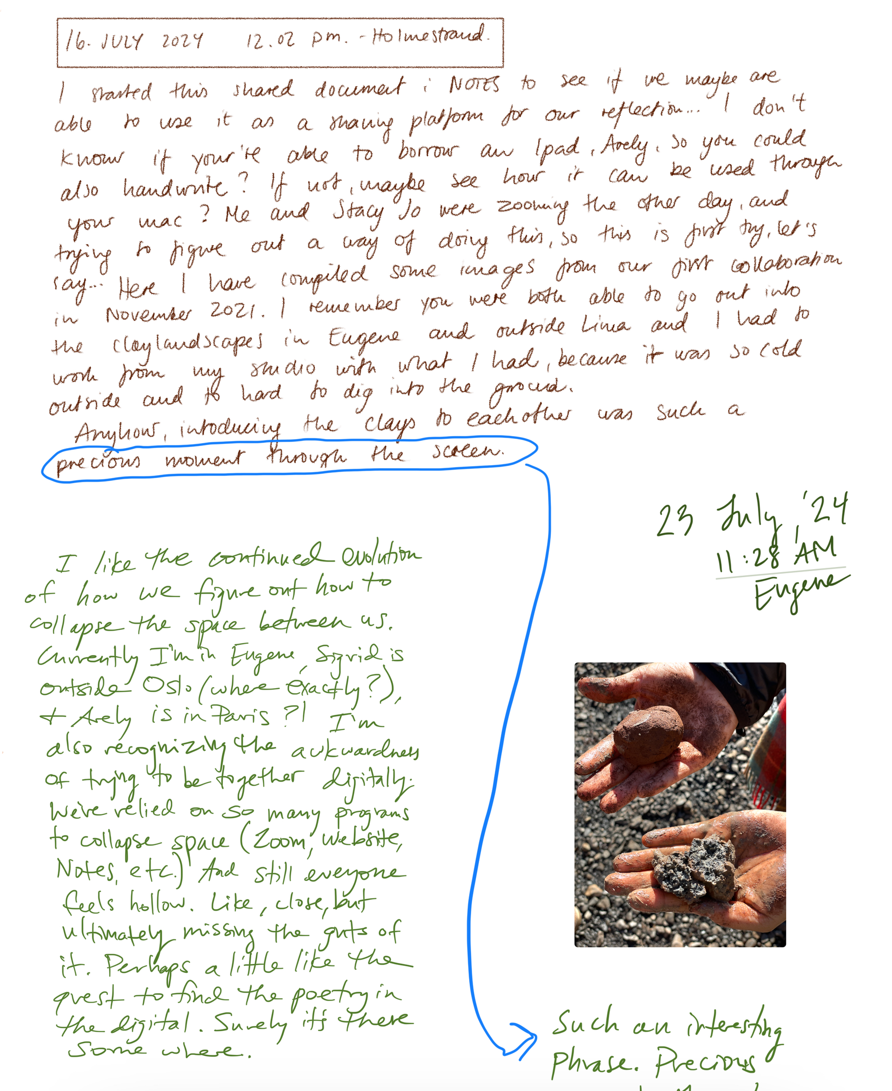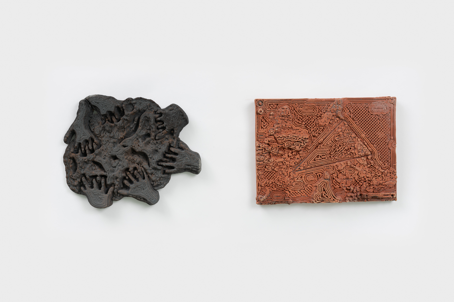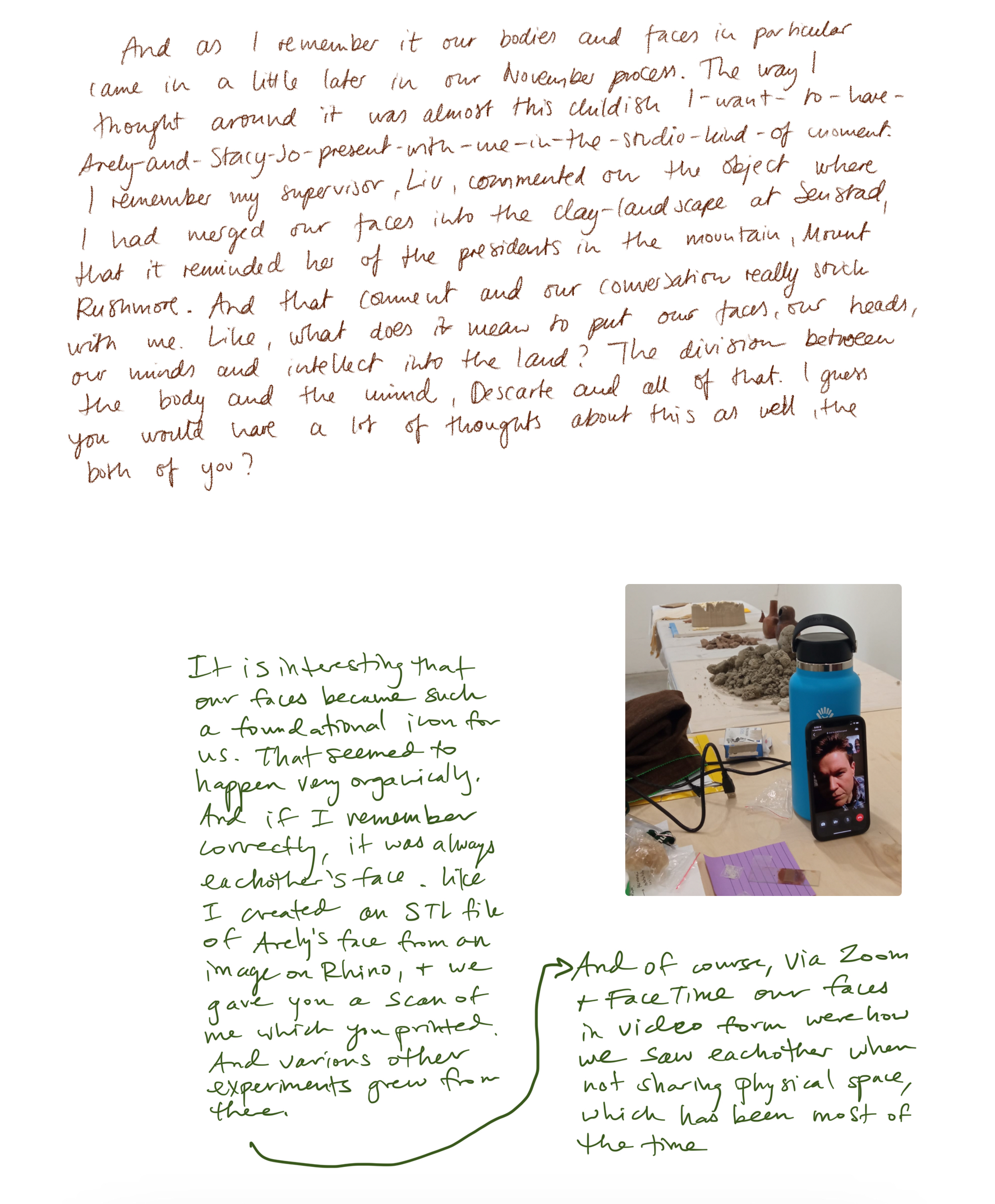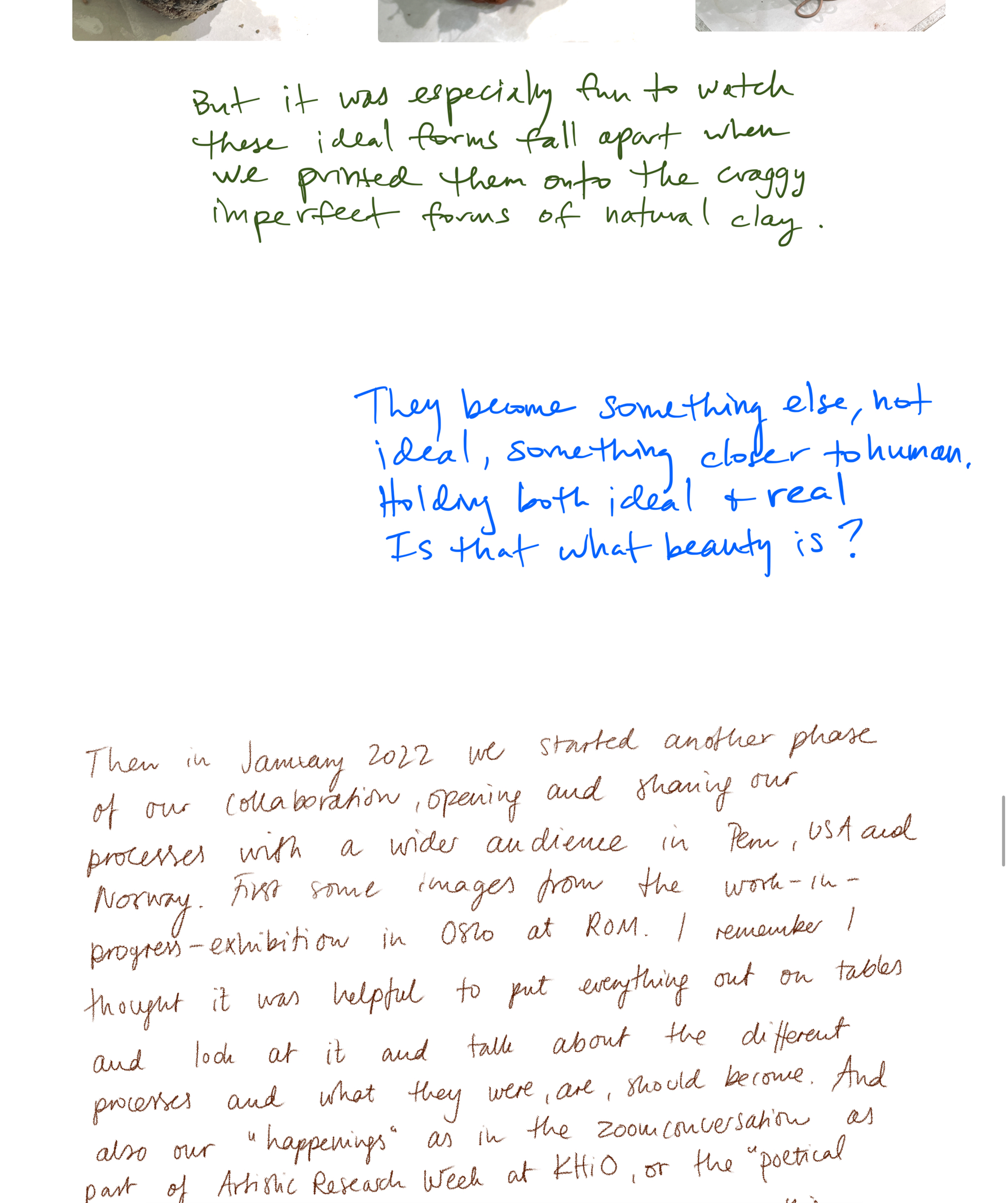 Til høyre: 2,5x23,5x21 cm, 3D-printet, brent blåleire fra Feiring Bruk, avdeling Kulmoen, originalt fra Breivollveien 25C, Alnabru, Oslo. Objektet er dekket av rå leire fra samme sted i form av en terra sigillata. 3D-printen er basert på en tegning fra en drøm jeg hadde under min, Stacy Jo og Arely´s samarbeidsperiode i ROM studio/ Carnation Contemporary i januar 2022. Arely hadde reist til Oregon for å møte Stacy Jo for første gang. De sendte over et bilde der de blandet leire fra Lima sammen med leire fra Eugene med hendene sine. I drømmen min var alle henda våre i samme klump med leire som var en blanding av leire fra Eugene, Oslo og Lima. Da jeg våknet opp, tegnet jeg tegningen. Tegningen er oversatt av programvaren Cura fra flatt bilde til et relieff basert på mørke og lyse farger.