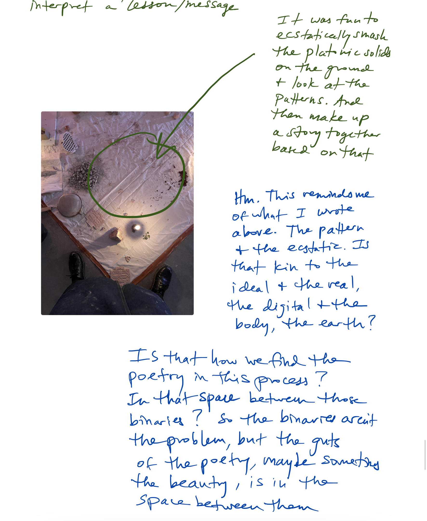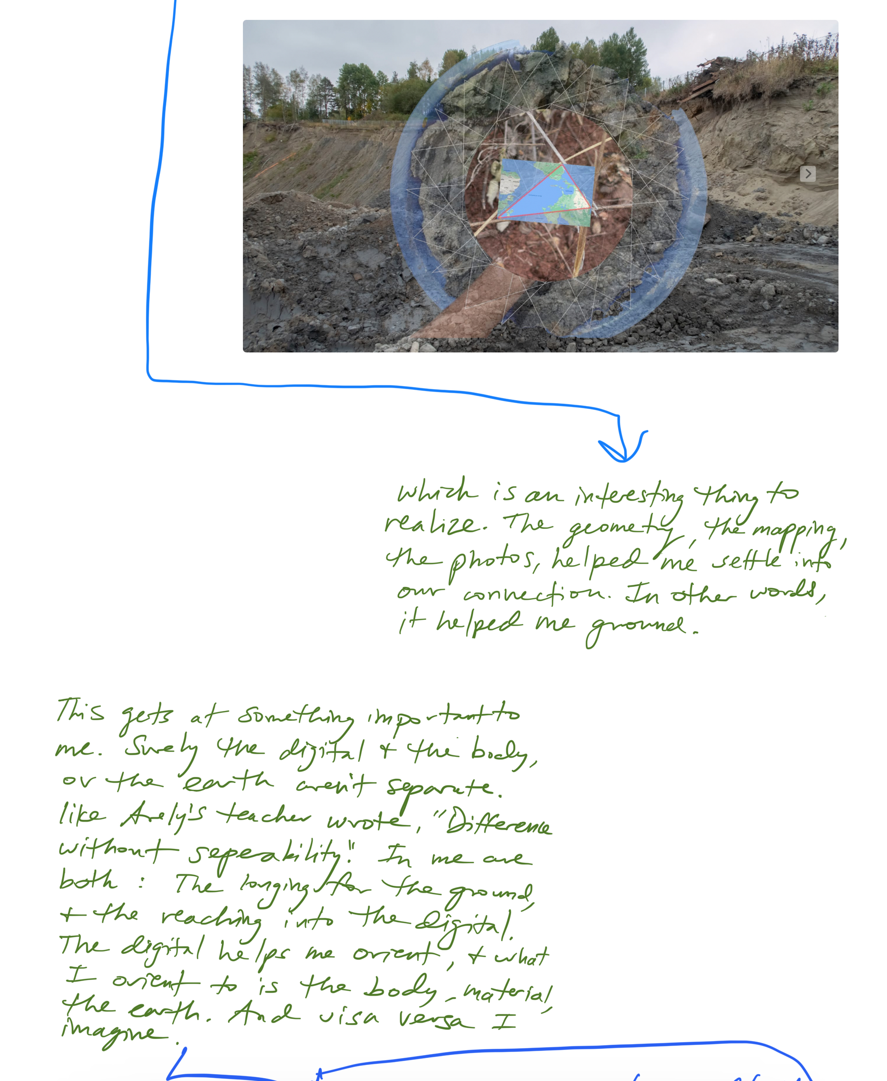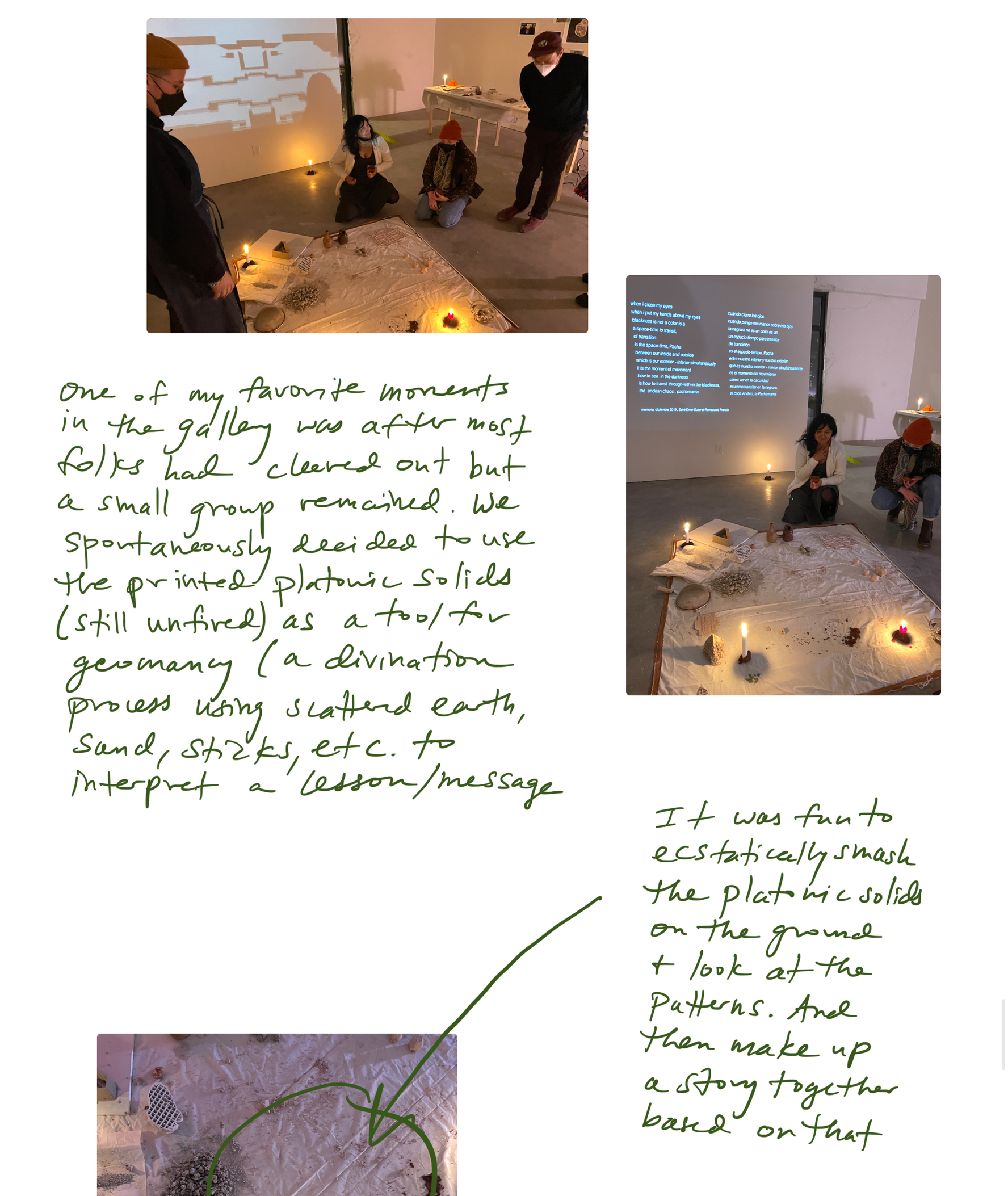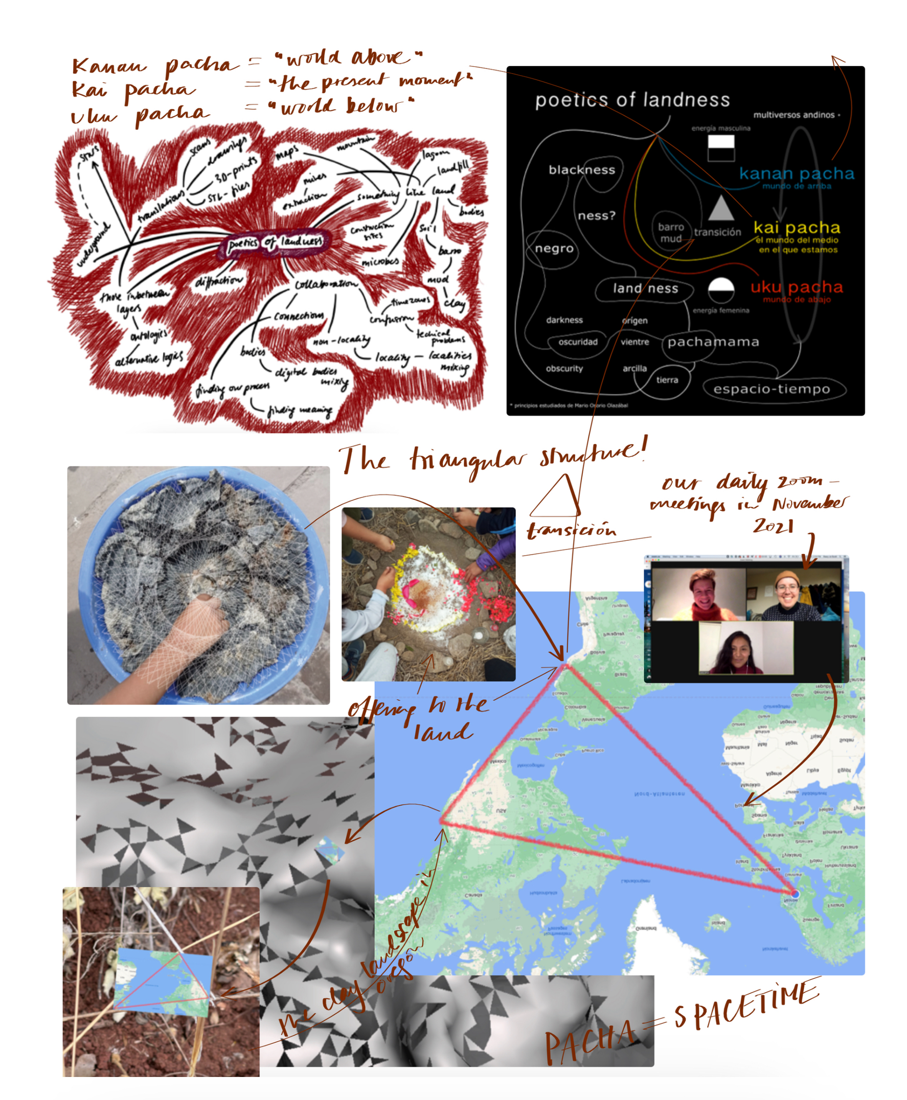 Som en metode har vi brukt våre lokasjoner, som danner en triangel, til å tenke over triangelen som struktur. Arely har introdusert prinsipper studert av Mario Osorio Olazábal om Andianske multiverser der triangelen representerer Kay Pacha (midtverdenen vi befinner oss i), og transformasjon. I den digitale verden, som på mange måter har vært vår møteplass og vårt felles språk, er triangelen formen som alle former kan deles inn i.
