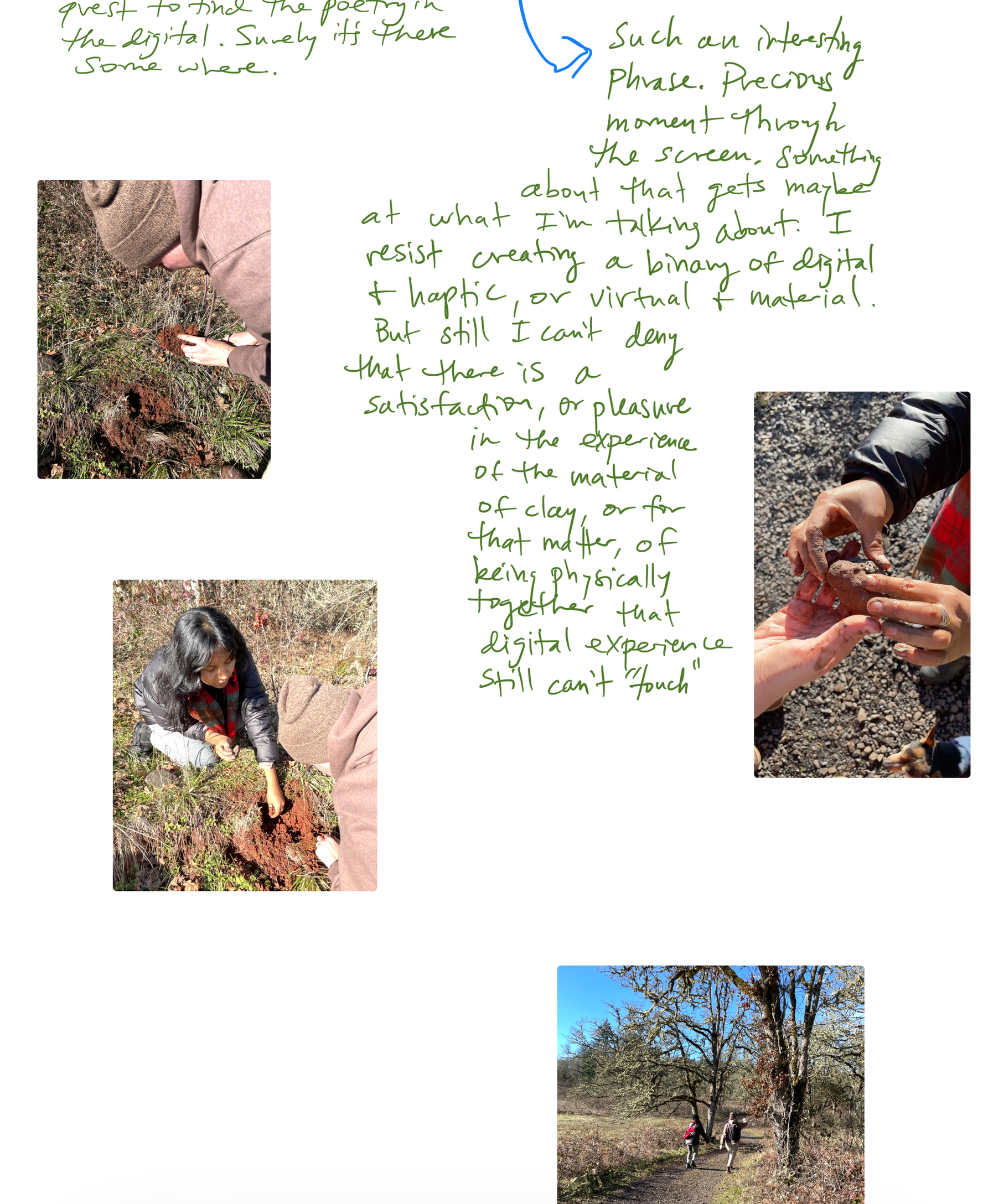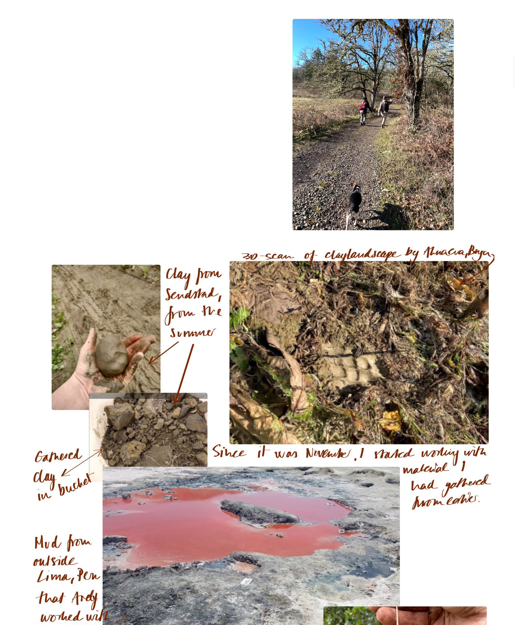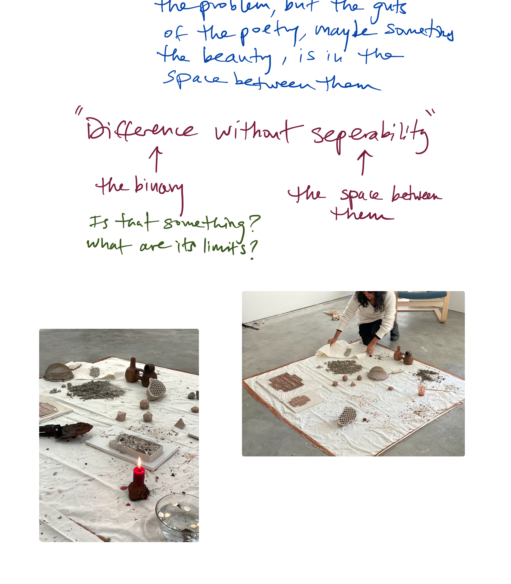 Vi ser på leire, jord og gjørme som en slektslinje som gir oss en kritisk arena for utforskning som kanskje kan hjelpe oss å lytte, huske og kroppsliggjøre. Sammen tenker vi at potensialet til land og kreativ praksis kan forstyrre selve grunnlaget for moderne representasjon og pågående systematisk, kolonial vold.”