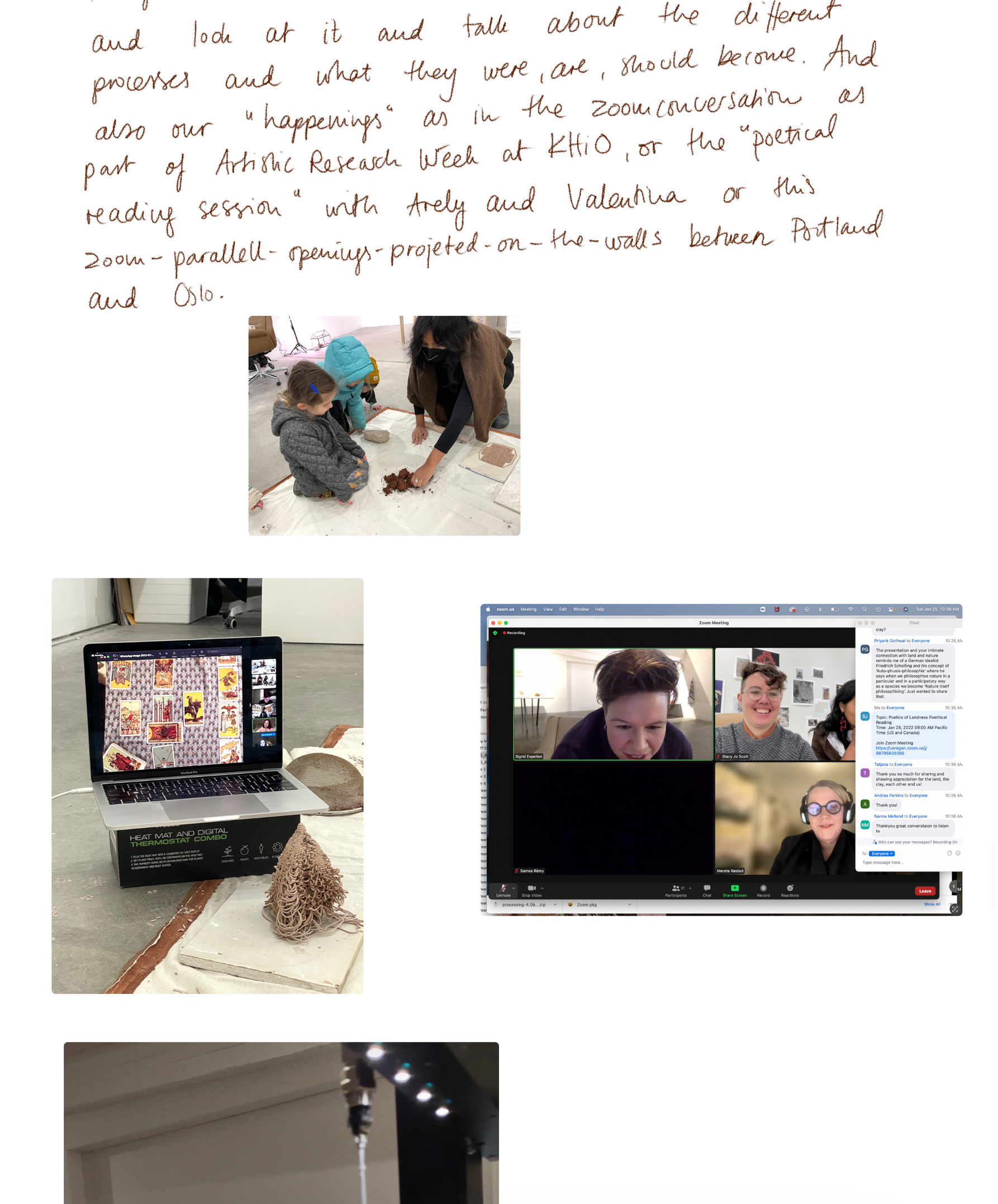 Videoklipp fra en zoomsamtale mellom meg, Arely Amaut og Stacy Jo Scott, moderert av Merete Røstad som en del av Kunstnerisk forskningsuke på Kunsthøgskolen i Oslo 2022. Hun som spør spørsmålet heter Sonja Dahl.