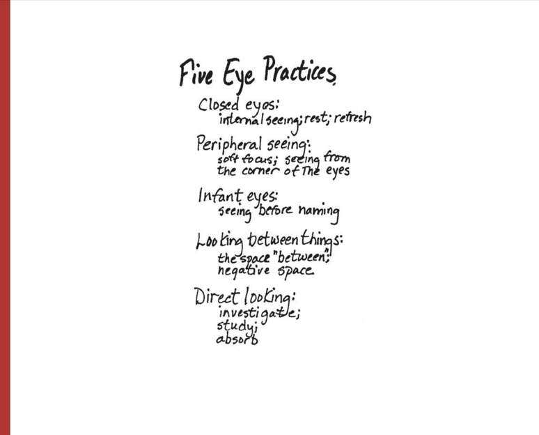 'Soft Eyes' was introduced in the first session along with a reminder of 'Five EyePractices' from Barbara Dilley. We included the following invitations at different times: