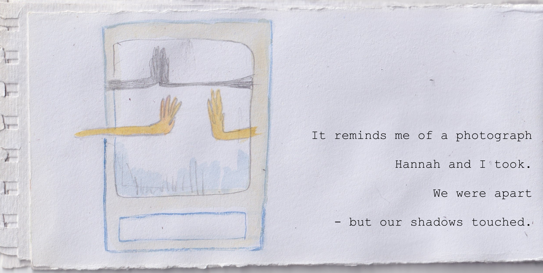 The video glitched and would not send. Instead Hannah sent an audio file. This is 2 minutes of 5minutes. It prompted thoughts around listening with our eyes, and the eyes of the skin and the intimacy of not knowing.