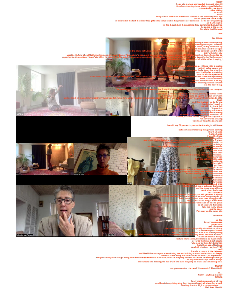 In this score/experiment, Mover and Witness meet online using Zoom digital platform. The score allows each person to take a turn to move (about 20 minutes) with ten minutes for talking about the mover's experience before the roles reversed.