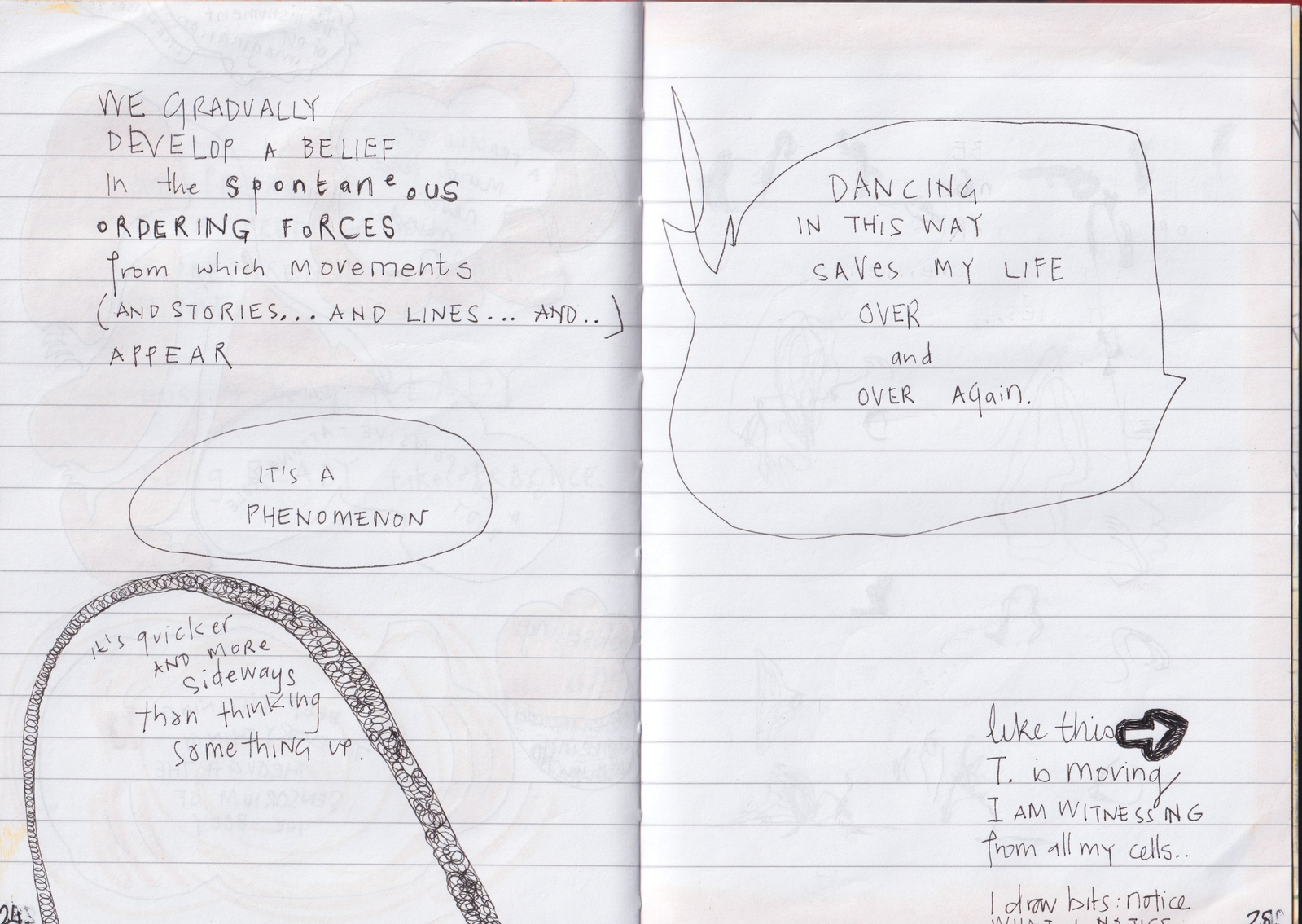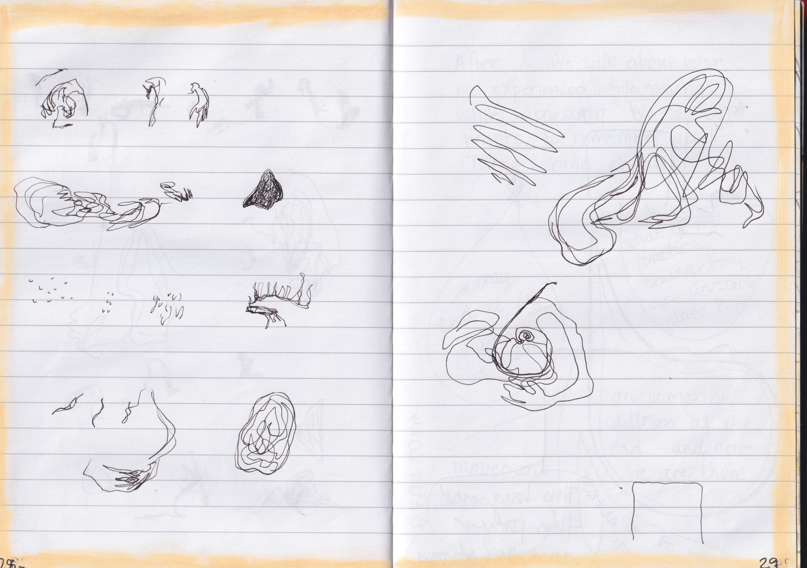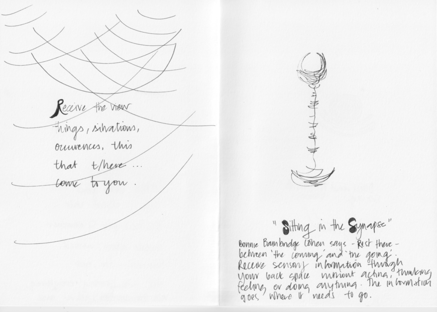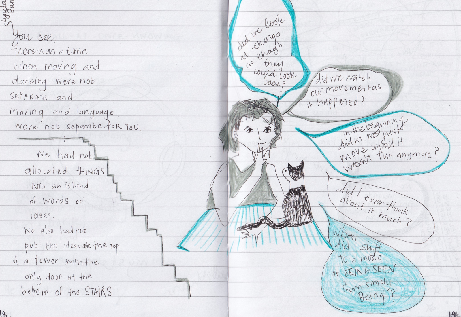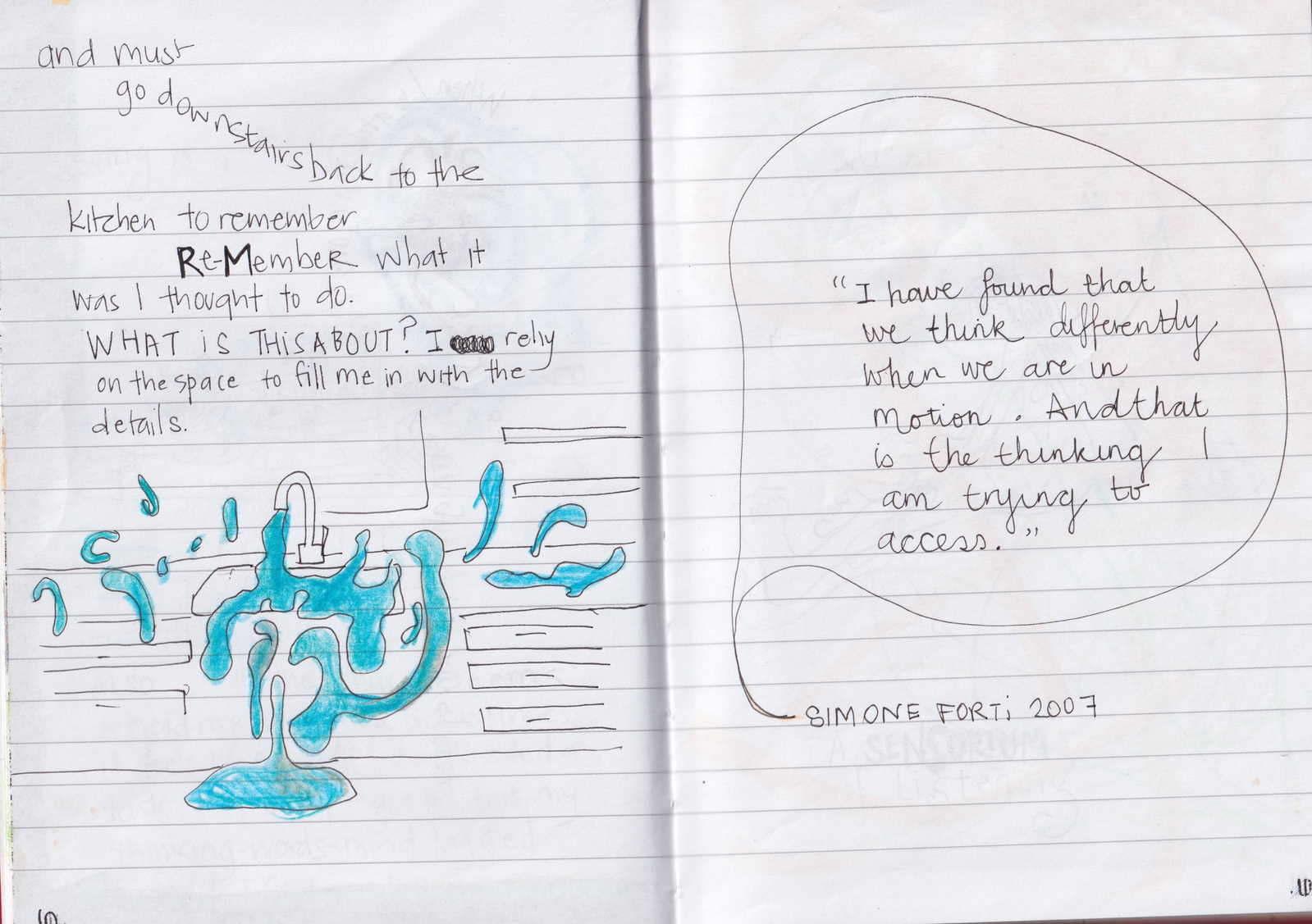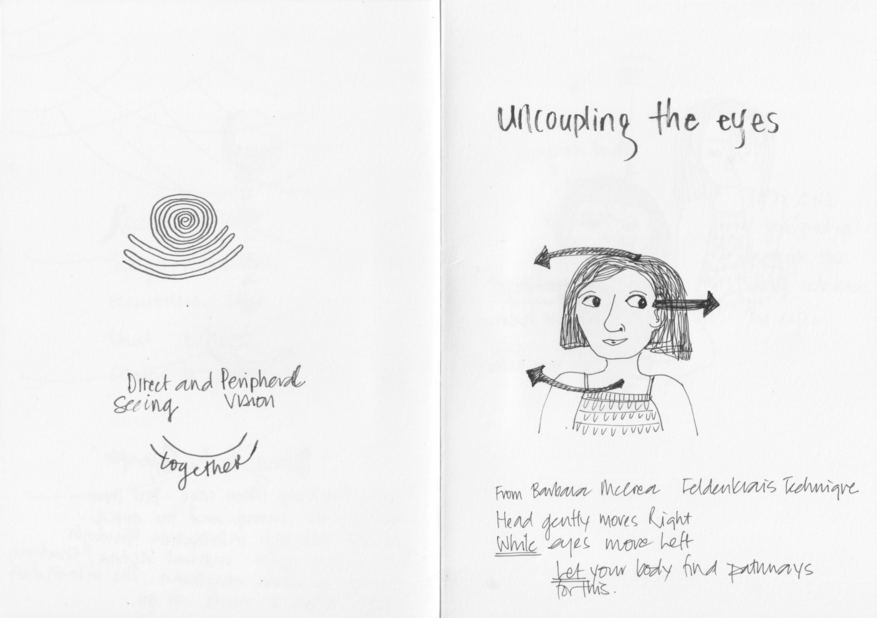 I made and kept this 'alongside' notebook as an accompaniment to the research process. It is a record of the möbius- strip-thinking necessary around moving and being moved, seeing and being seen. The tone of the research thinking-doing turned me inside out. It was partly because some of the qualitites of experience are only to be glimpsed, and never grasped. There were flashes of momentary insight. I have been learning to skate the osccilation between delicate precision and the richness of a foggy place of knowing. So I drew and wrote, as hints to the experience, and as a lure for memory. This was my way of coming closer to sense-making, to deal with my fear of losing what I experienced, when needing to whittle the knowing to make sense in academic protocols.