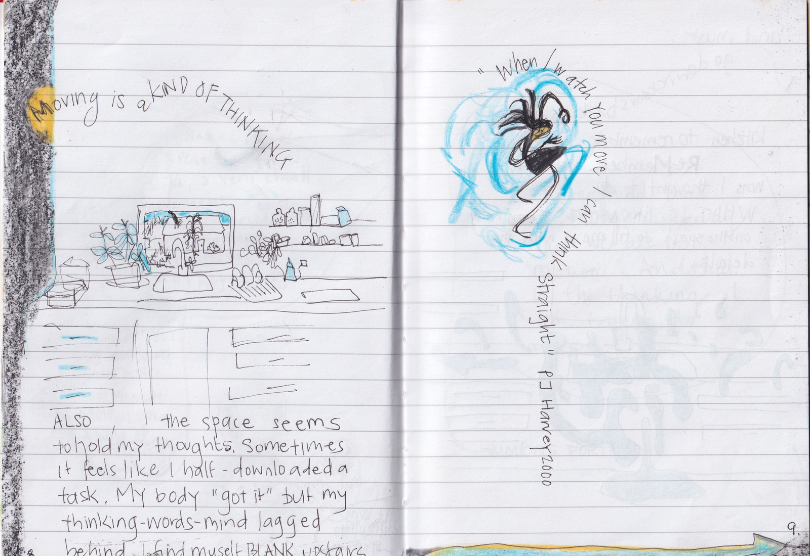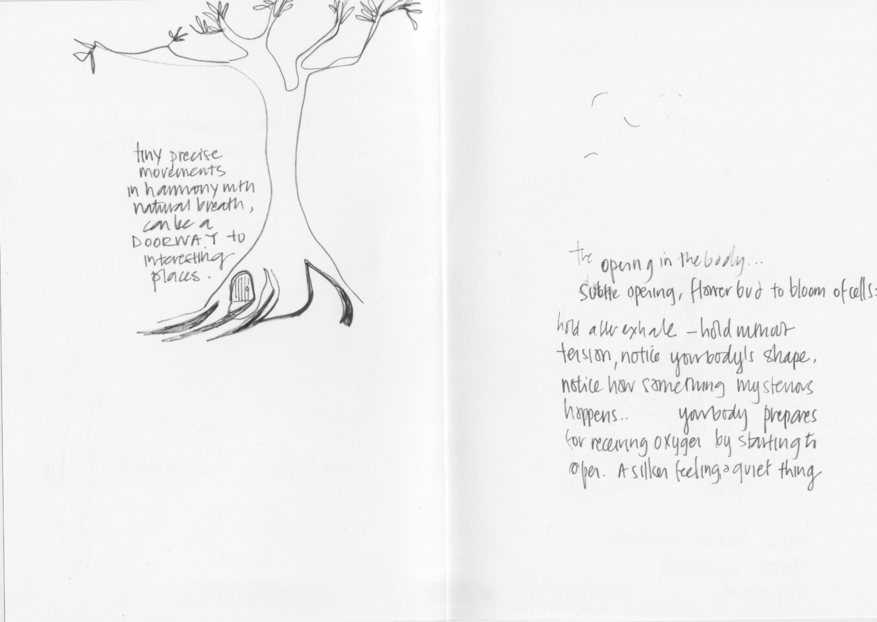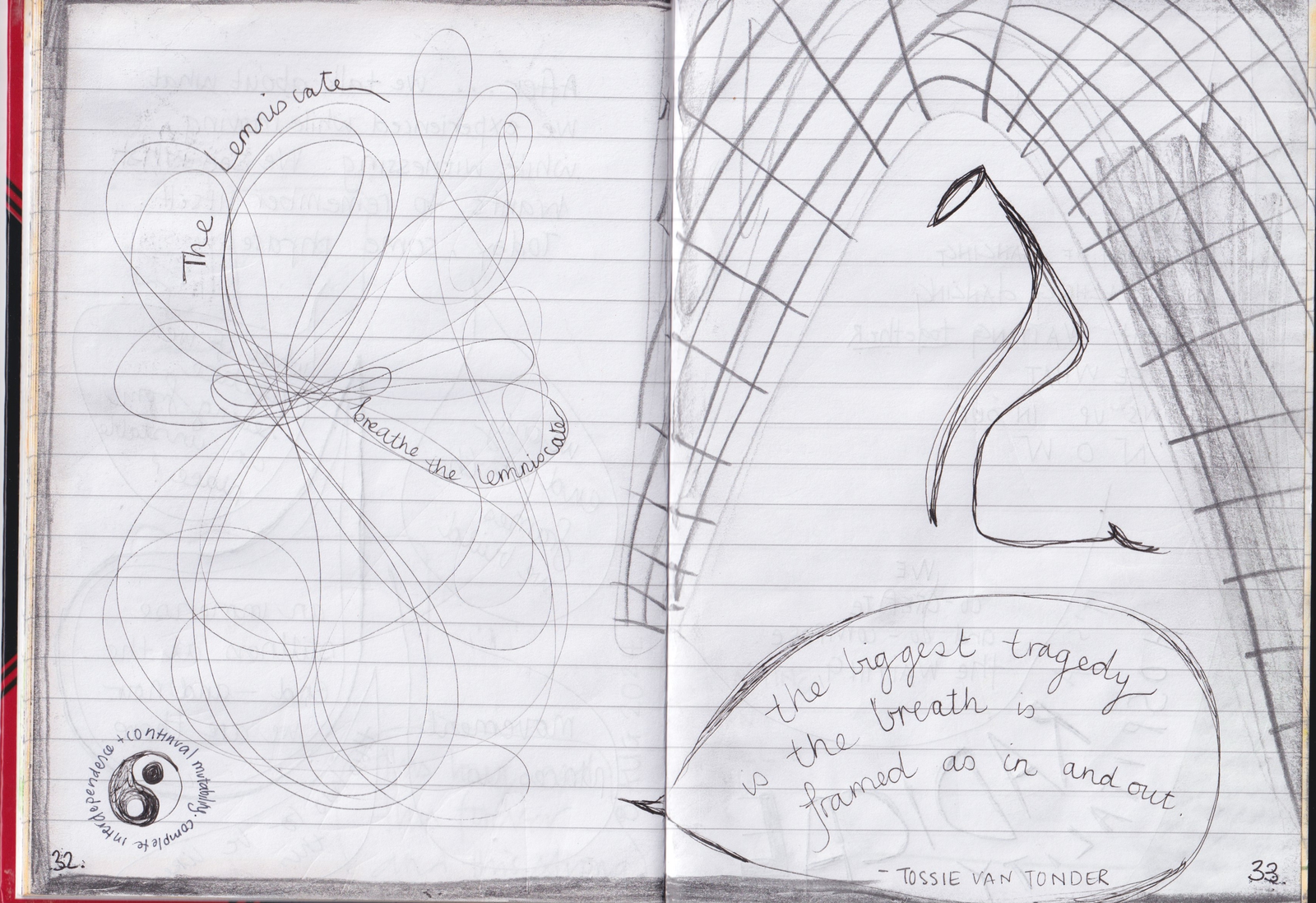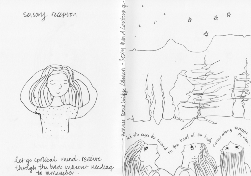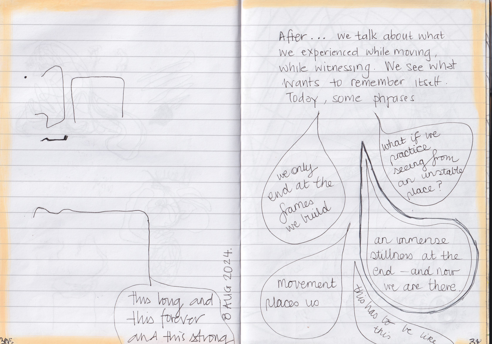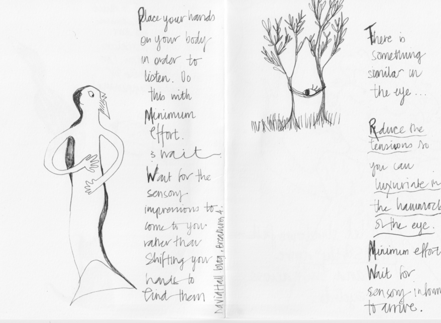 I made and kept this 'alongside' notebook as an accompaniment to the research process. It is a record of the möbius- strip-thinking necessary around moving and being moved, seeing and being seen. The tone of the research thinking-doing turned me inside out. It was partly because some of the qualitites of experience are only to be glimpsed, and never grasped. There were flashes of momentary insight. I have been learning to skate the osccilation between delicate precision and the richness of a foggy place of knowing. So I drew and wrote, as hints to the experience, and as a lure for memory. This was my way of coming closer to sense-making, to deal with my fear of losing what I experienced, when needing to whittle the knowing to make sense in academic protocols.