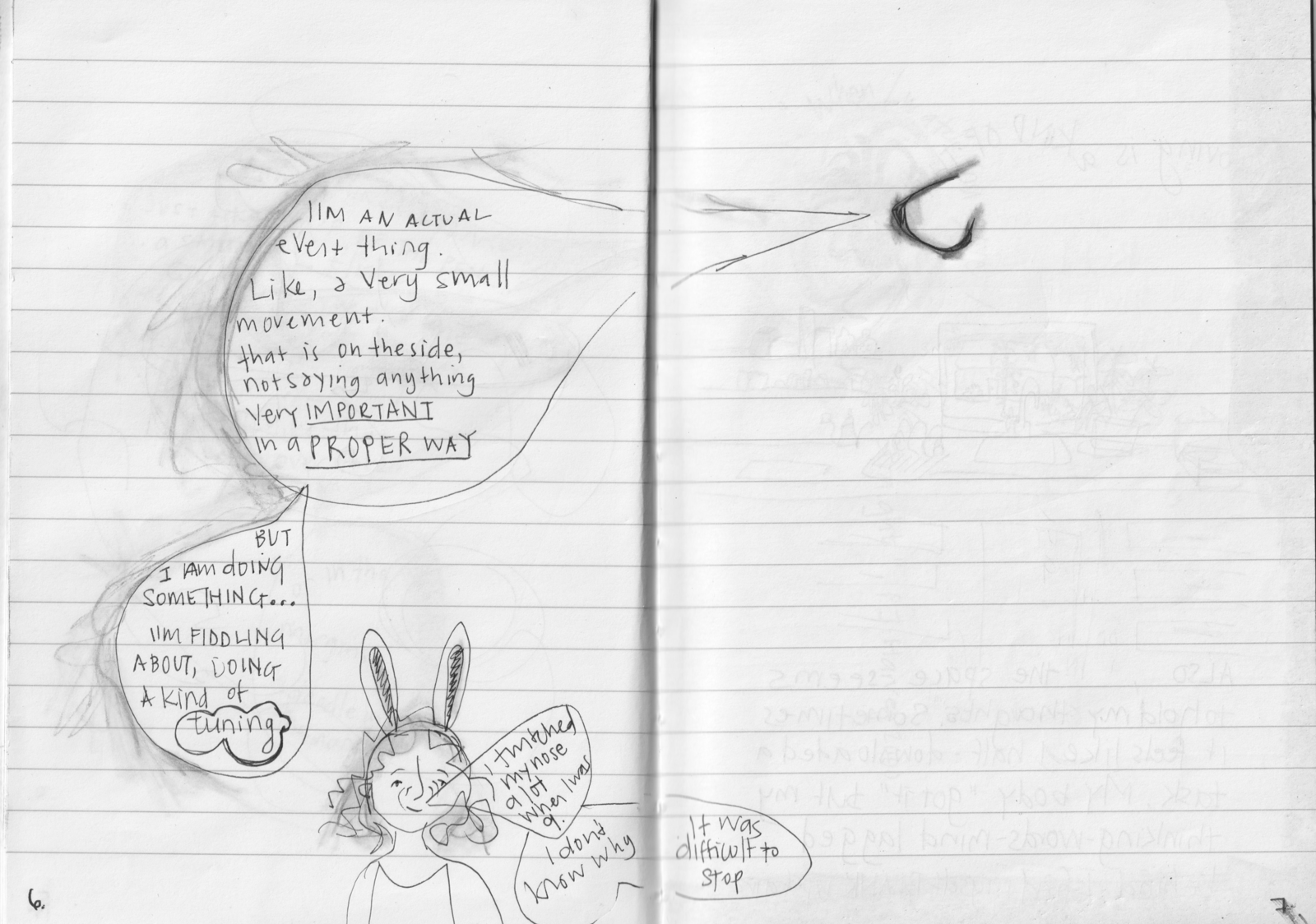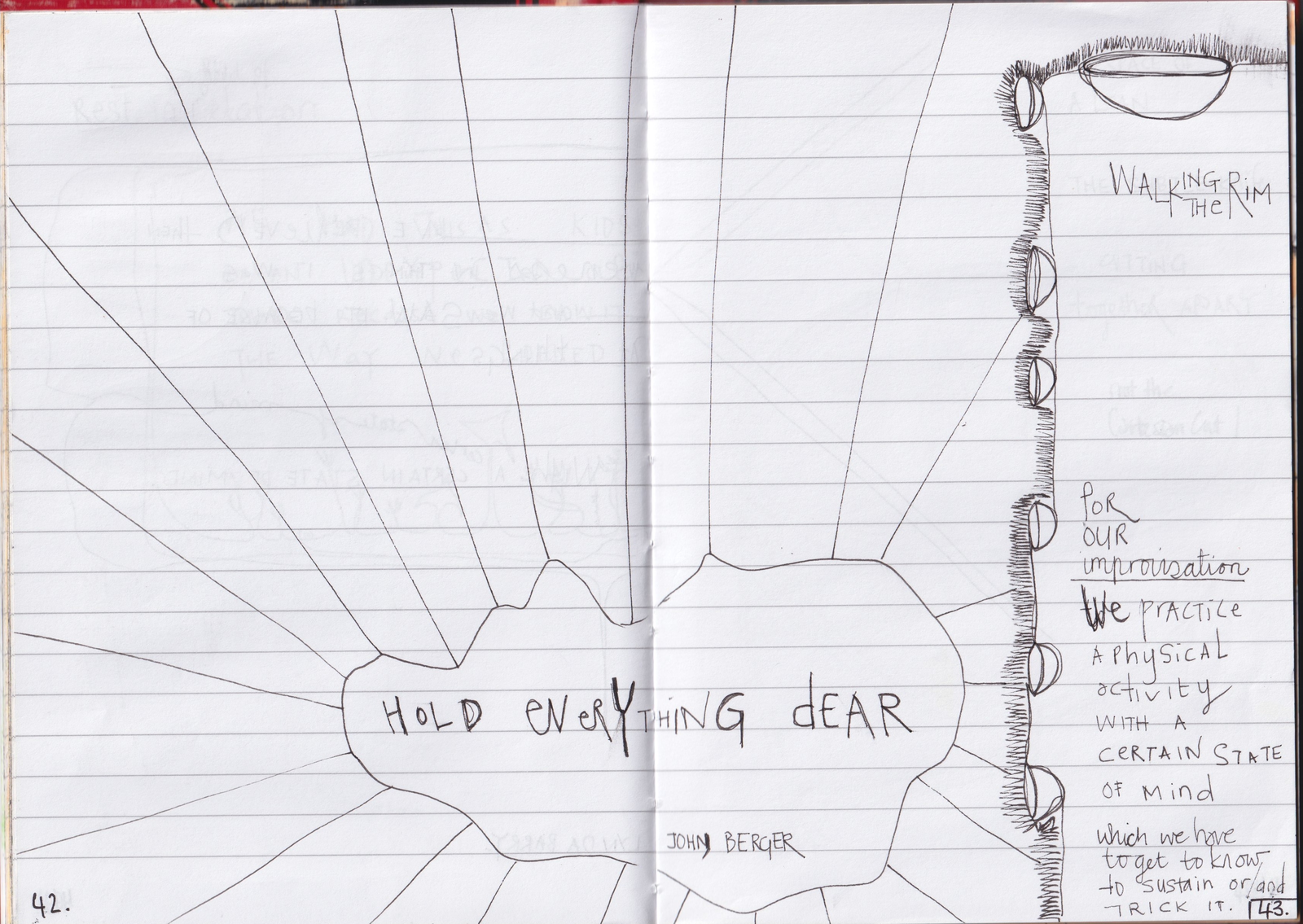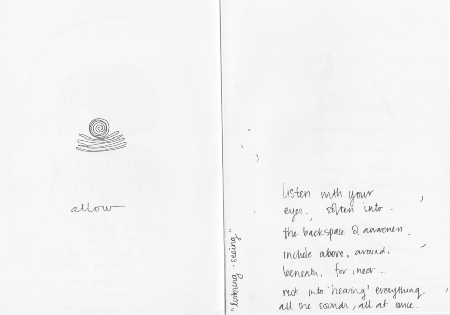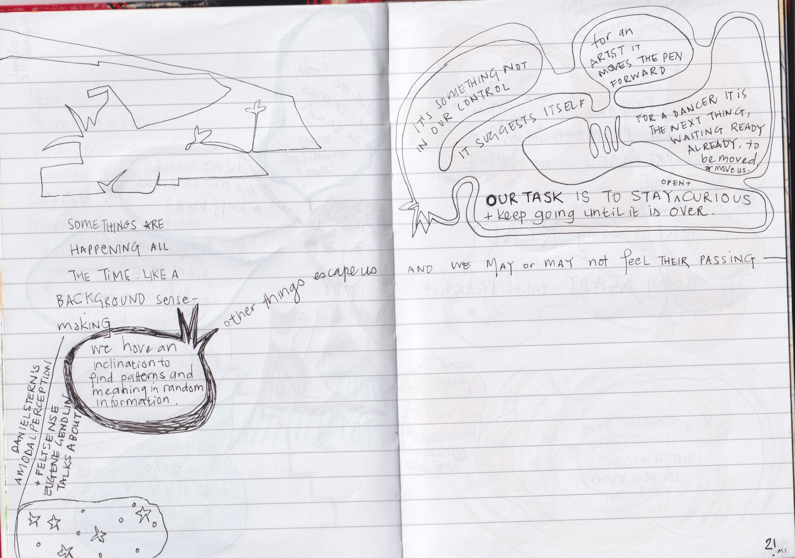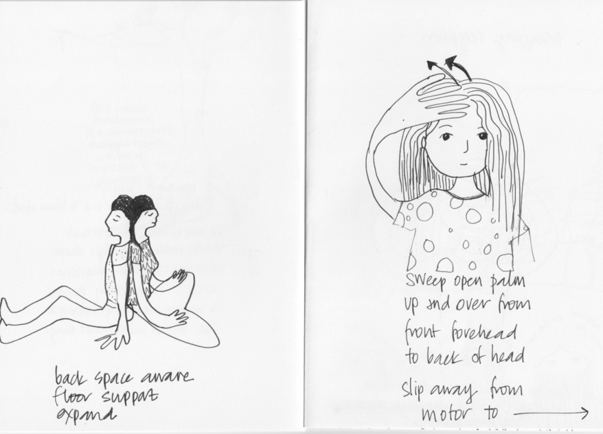 I made and kept this 'alongside' notebook as an accompaniment to the research process. It is a record of the möbius- strip-thinking necessary around moving and being moved, seeing and being seen. The tone of the research thinking-doing turned me inside out. It was partly because some of the qualitites of experience are only to be glimpsed, and never grasped. There were flashes of momentary insight. I have been learning to skate the osccilation between delicate precision and the richness of a foggy place of knowing. So I drew and wrote, as hints to the experience, and as a lure for memory. This was my way of coming closer to sense-making, to deal with my fear of losing what I experienced, when needing to whittle the knowing to make sense in academic protocols.