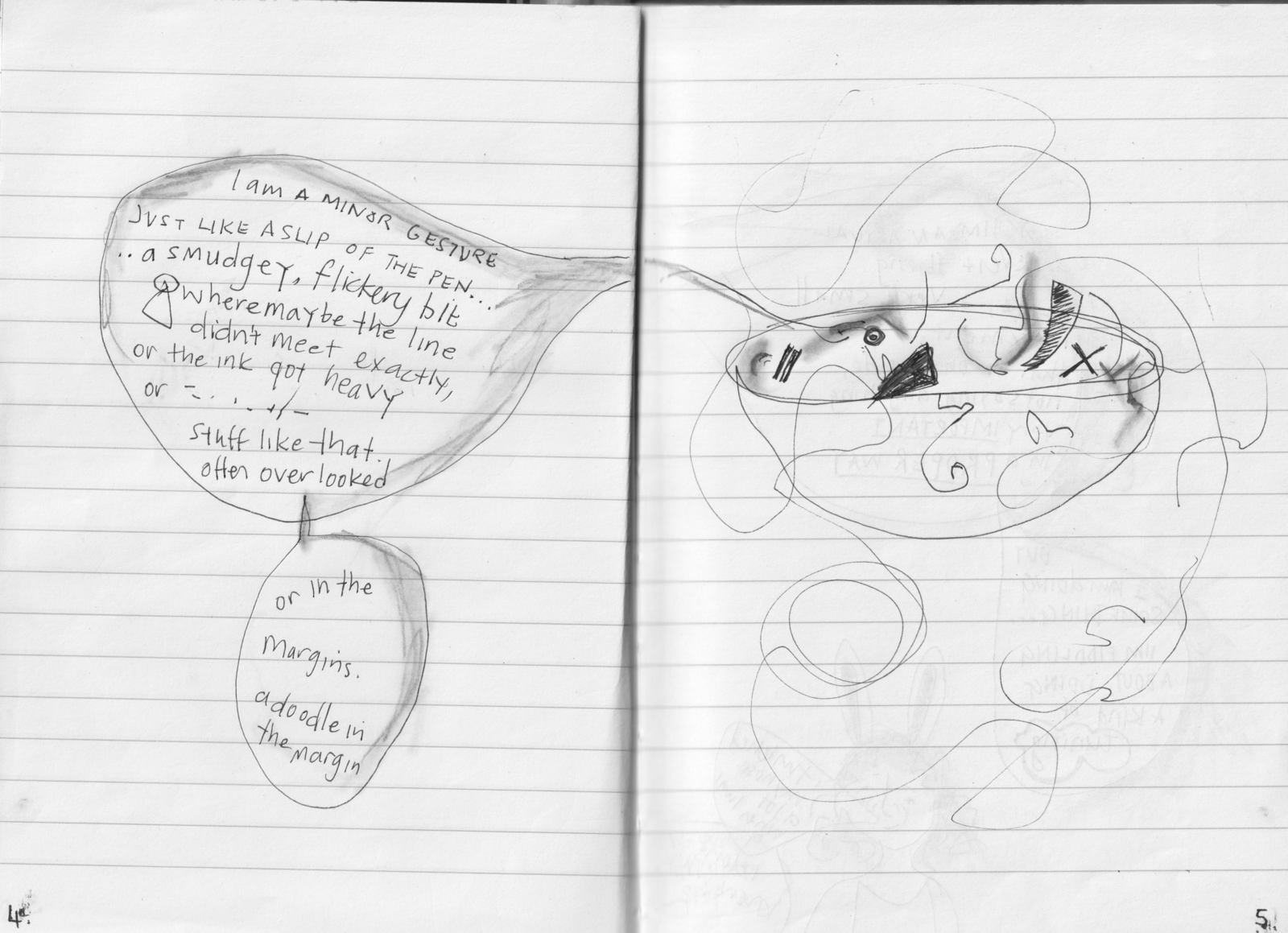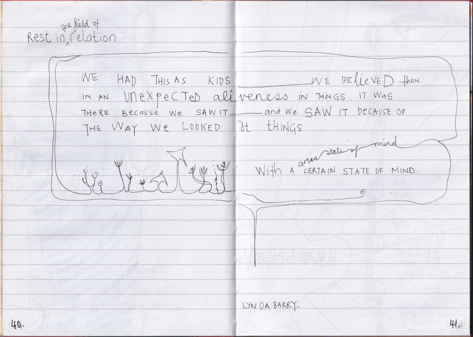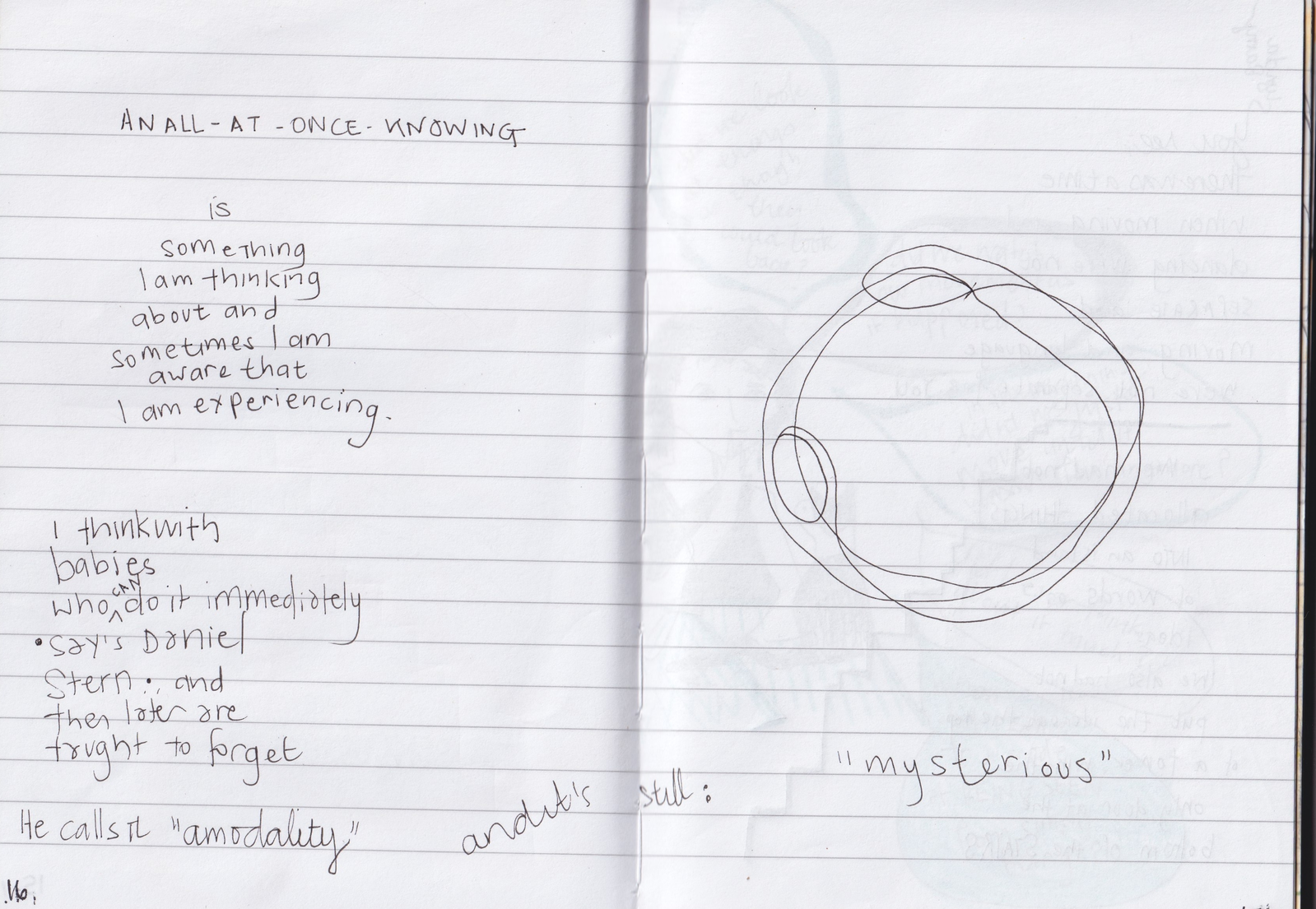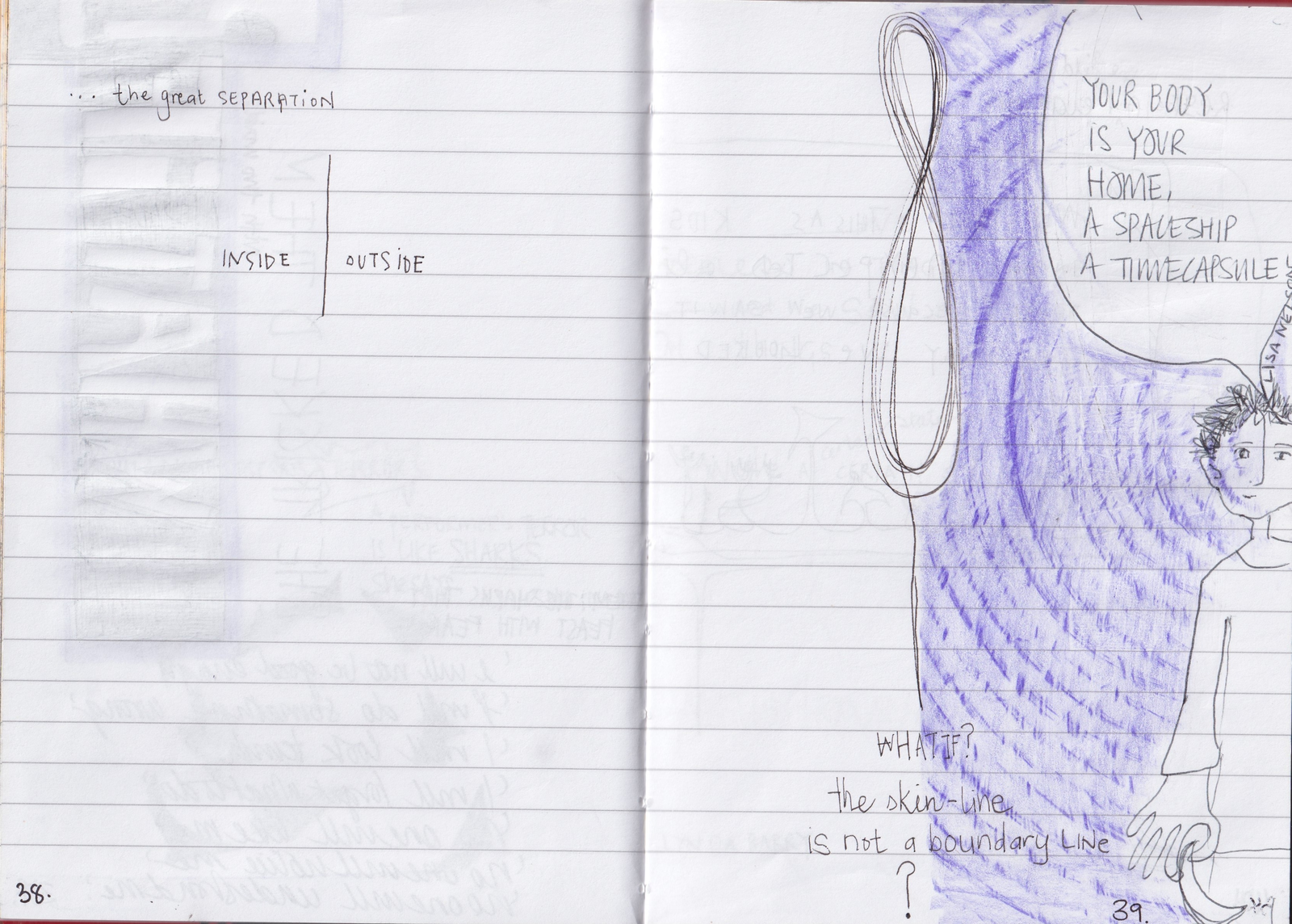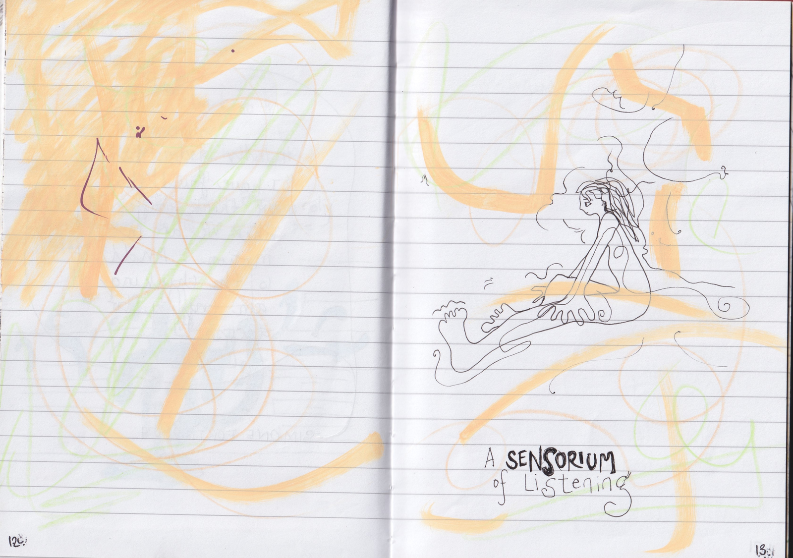 I made and kept this 'alongside' notebook as an accompaniment to the research process. It is a record of the möbius- strip-thinking necessary around moving and being moved, seeing and being seen. The tone of the research thinking-doing turned me inside out. It was partly because some of the qualitites of experience are only to be glimpsed, and never grasped. There were flashes of momentary insight. I have been learning to skate the osccilation between delicate precision and the richness of a foggy place of knowing. So I drew and wrote, as hints to the experience, and as a lure for memory. This was my way of coming closer to sense-making, to deal with my fear of losing what I experienced, when needing to whittle the knowing to make sense in academic protocols.