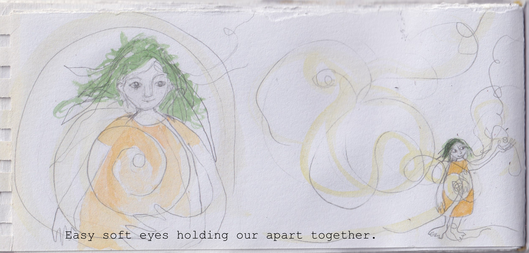 i n f i n i t e l y . It keeps going and spills over itself. This is how the world is made I am sure of it. The world is an excess of this, this froth of excitement stirred into the bone. It harnesses the glee in the laughter and shakes down, shakes into the sturdy bones of being and gets the air in the marrow participating with all its solemn integrity and purpose. It too re-patterns and resets. And then it is over. The human body is exhausted and spent, high alert clicks off and it rests, slows gears, down-changes, naps like a wolf and the true partner in the dance, the wave of Knowing, laughs a bright light laugh and finds other delights. I didn’t know how to place all these experiences, I confused them early on as attraction and now I feel the well-knowing of a different love, a worlding love. Name it perhaps - ‘For Give’. It’s texture is clear and immaculate and soft as a thin stream of water from the tap which runs cool, not making a sound, as you sip at the kitchen sink in the night sleeping house.