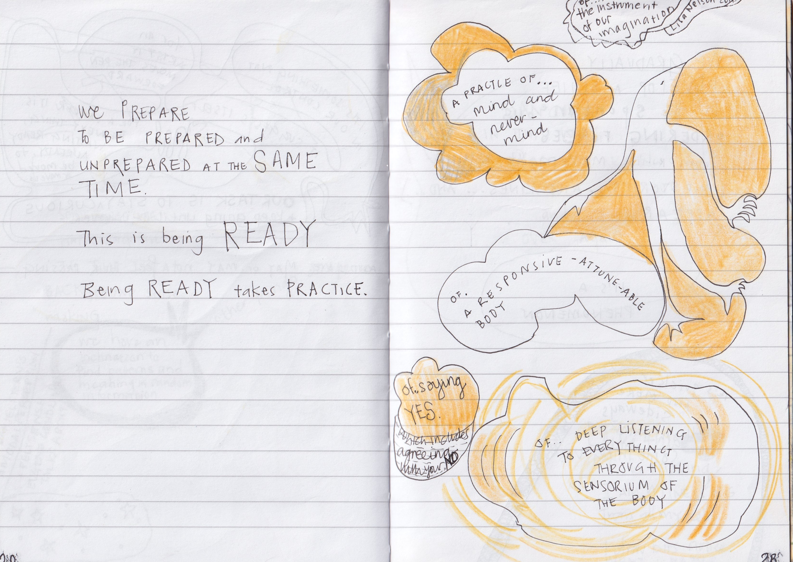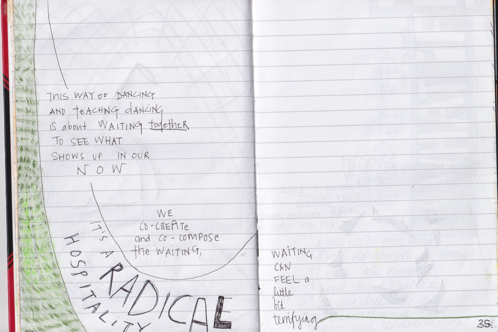 In the studio, an old church hall with newly refurbished wooden floor, we experienced what philosopher Denise Ferreira Da Silva memorably named ‘difference without separability ’2. Our vastly different physical abilities, backgrounds, languages, communication skills, historical privilege, economic class, energy labour for transport to the studio, gender, age and prior dance training meant talking would most often fall apart into disparity and frustration and positions of fixity. On the floor however, we found new ways to be together in and through moving, making, imagining, playing, sensing. Here on the floor, released from the grip of certainty, we approached something else through radical creative capacity and daring, through embodied imagination and empathy. Da Silva talks about a reassembly of ‘the fundamental components of everything to refigure the World as a complex whole without order’3. On the floor, in movement, this was possible. We could make a playground with the staples of Western Modern racial grammar ‘fear’ and ‘uncertainty’ and the violence of Western Modern thought. We could move-think the world otherwise. In taking movement improvisation seriously it is precisely the skills of the improviser that I interrogate and wish to teach: their ability to meet uncertainty with curiosity and their stamina to dwell in the unclear and confused, the vague, while widening attention for the precision of the ‘wiggle room’4 .