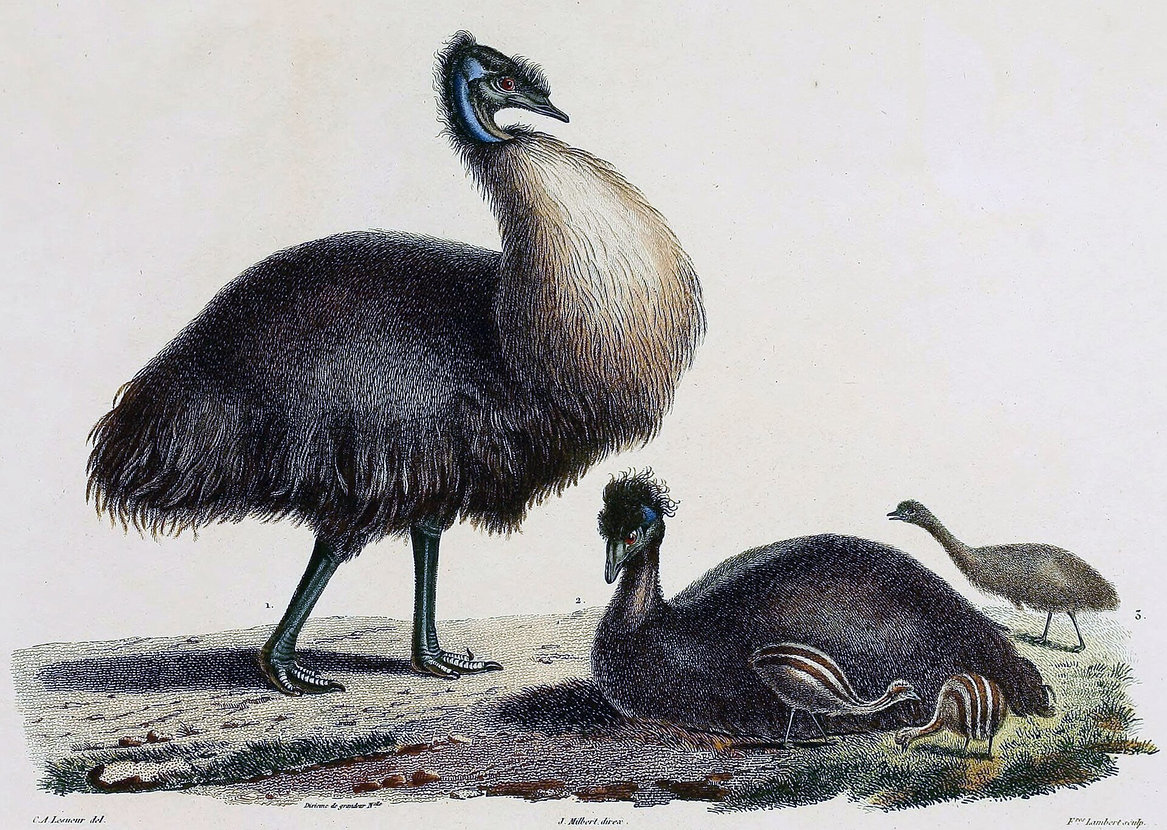 Illustration of Dromaius peroni (now a synonym of Dromaius baudinianus – Kangaroo Island emu), but it was actually based on a specimen in the Museum of Natural History in Paris, now thought to belong to Dromaius ater from King Island, also known as Dromaius novaehollandiae minor.