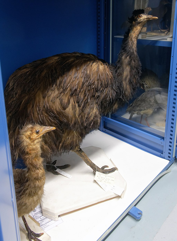King Island emu (Dromaius novaehollandiae minor) in the collections of the French National Museum of Natural History. The chick is likely a mainland emu.