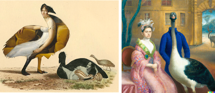 Paper collage (left) and AI- generated image (right) of Empress Josephine with dwarf emu, created by Zoë Sadokierski and DALL•E 2, 2023–24.