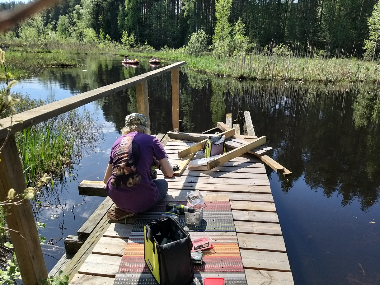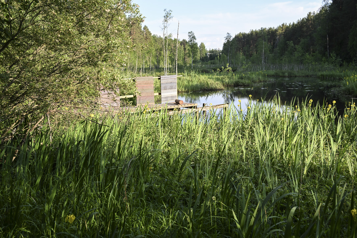 All the different parts of the artwork were prepared beforehand in my studio during spring 2023. I sawed, measured and painted the materials, and the entire construction had to be carefully planned because it was not possible to get close to the site by car and all the materials for the work had to be transported by foot along paths down to the shore.