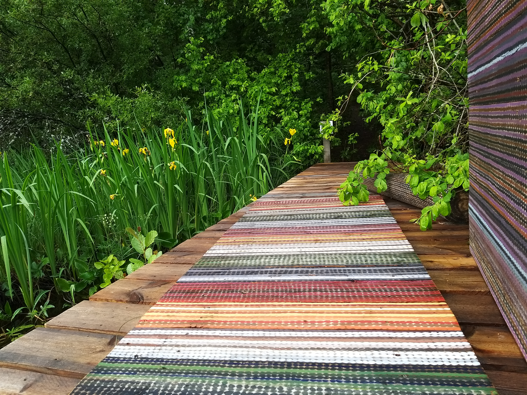 The location of the artwork in a nature reserve set certain conditions for its construction. Permission for the work had to be obtained from the local authorities, and the permit was conditional: permanent structures in the river were prohibited, as well as any alteration or damage to vegetation. The artwork was made from (recycled) thermally modified pine. Thermal modification is an ecological and non-toxic way to increase the weather resistance of wood.