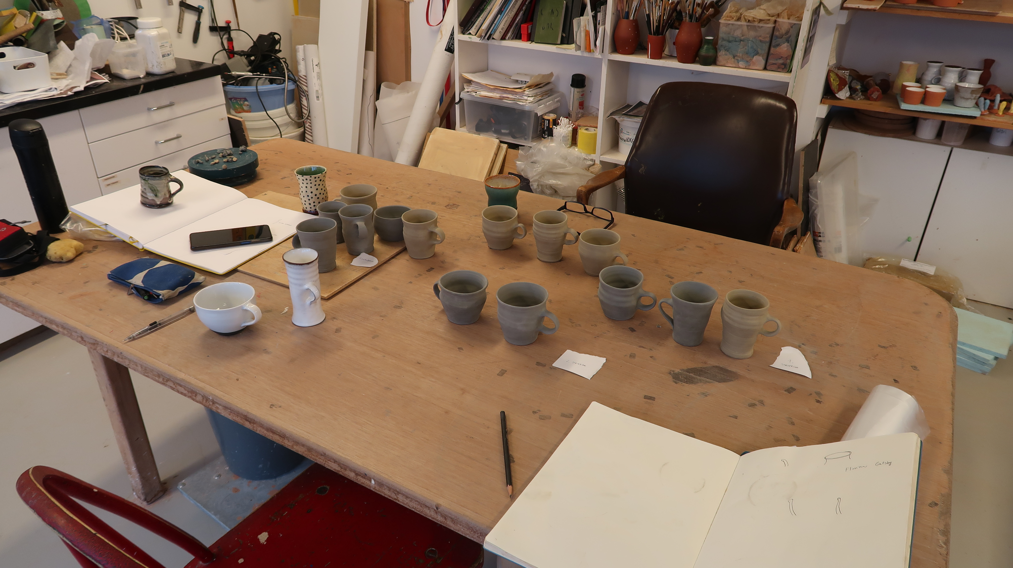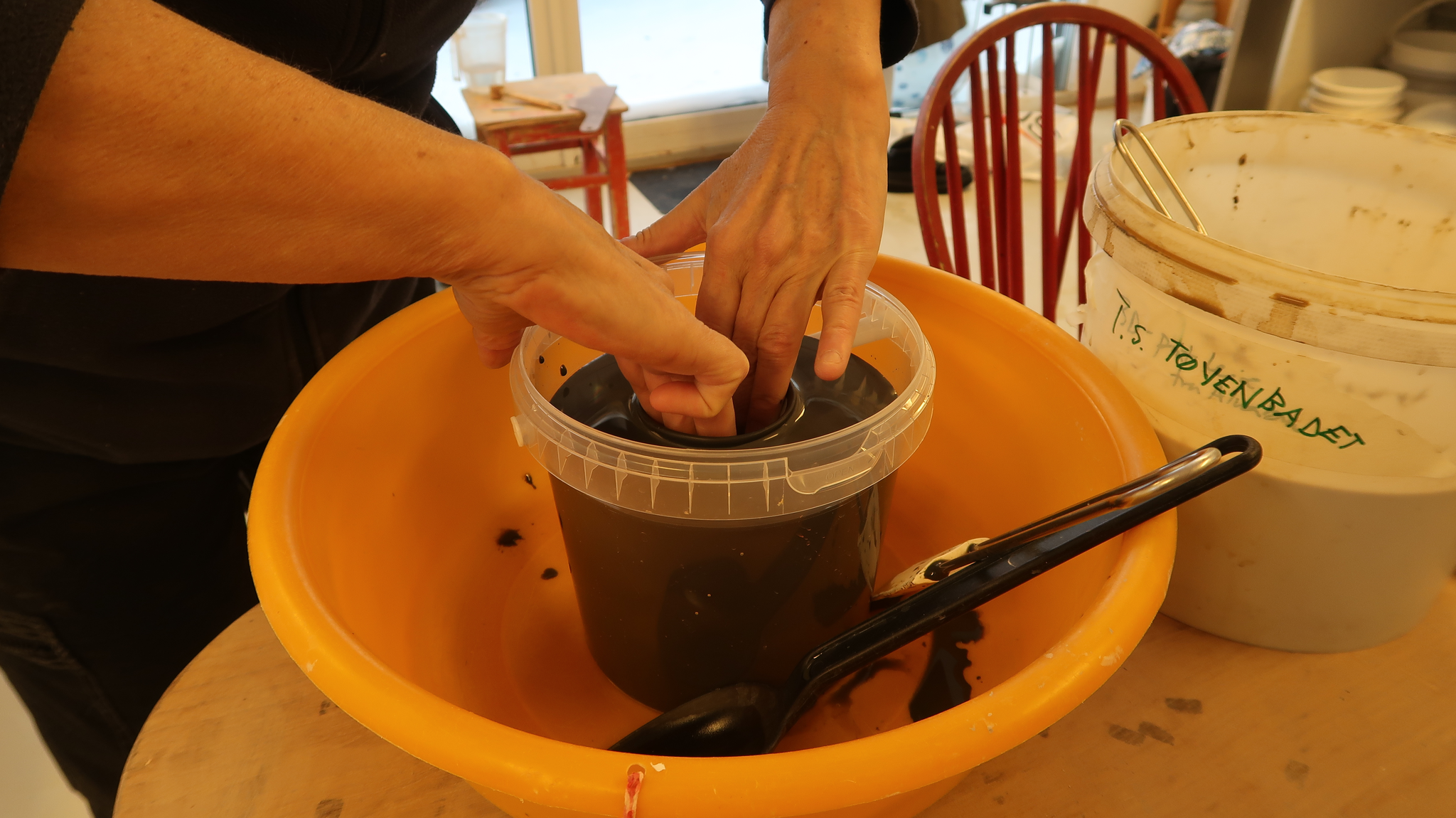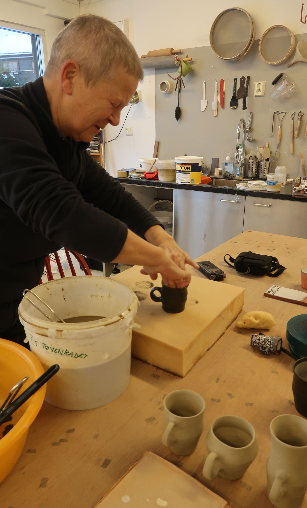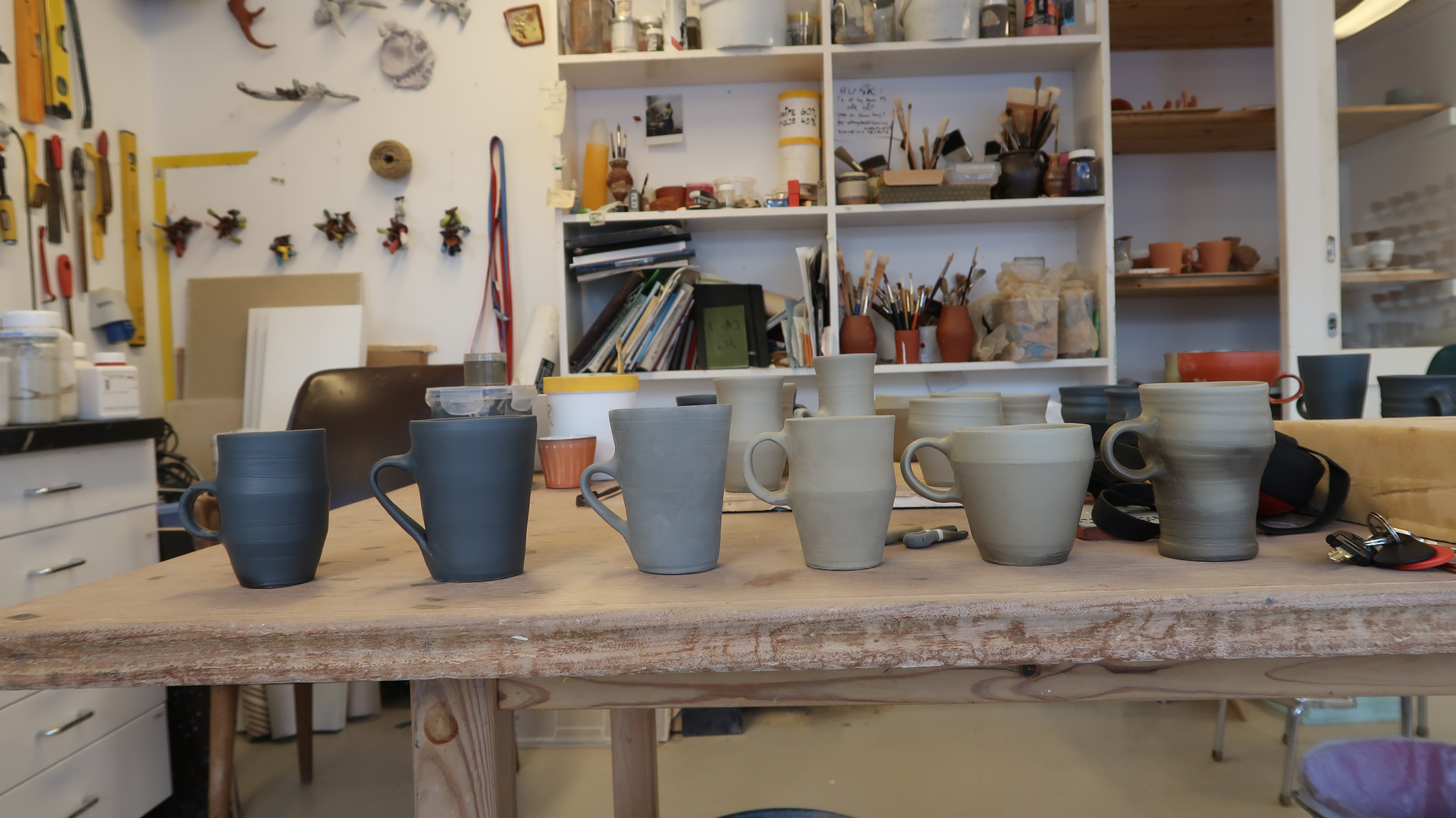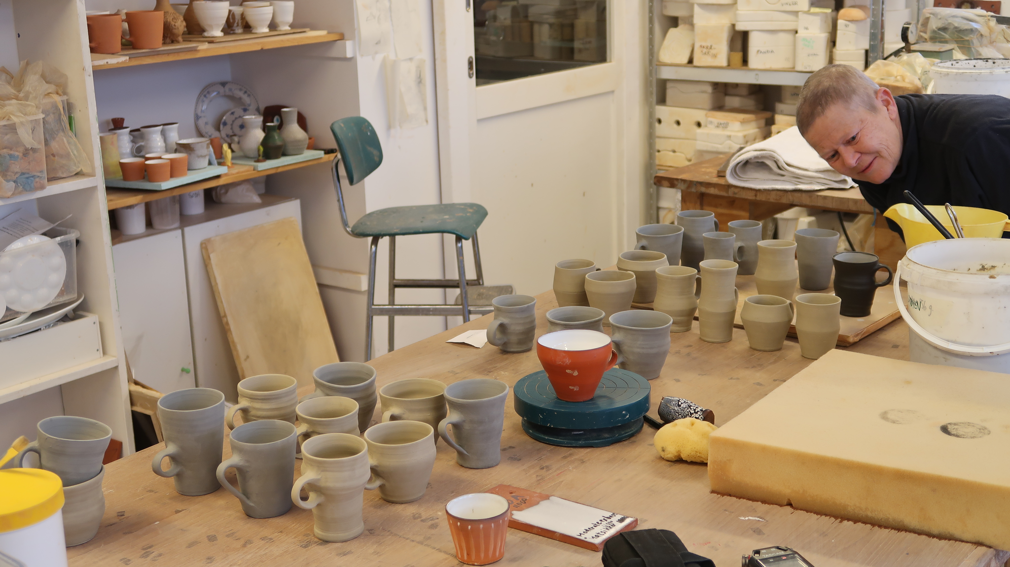S Så jeg tenkte at jeg ville lage noe sosial keramikk som kan brukes i samtaler med folk jeg inviterer ut i feltet. At det er så fint å drikke fra kopper som er lagd fra det leirelandskapet vi er i. Men jeg sitter ikke og dreier så mye eller ofte, i det hele tatt. Jeg lager bruksting her og der, men det er ofte litt sånn, ikke tilfeldig, men det blir på siden på en måte. Så jeg tenkte det var veldig viktig å gjøre dette ordentlig og i samtale og samarbeid med noen som jobber med det mye. Og tenker over de tingene som er viktige når man jobber med funksjon.