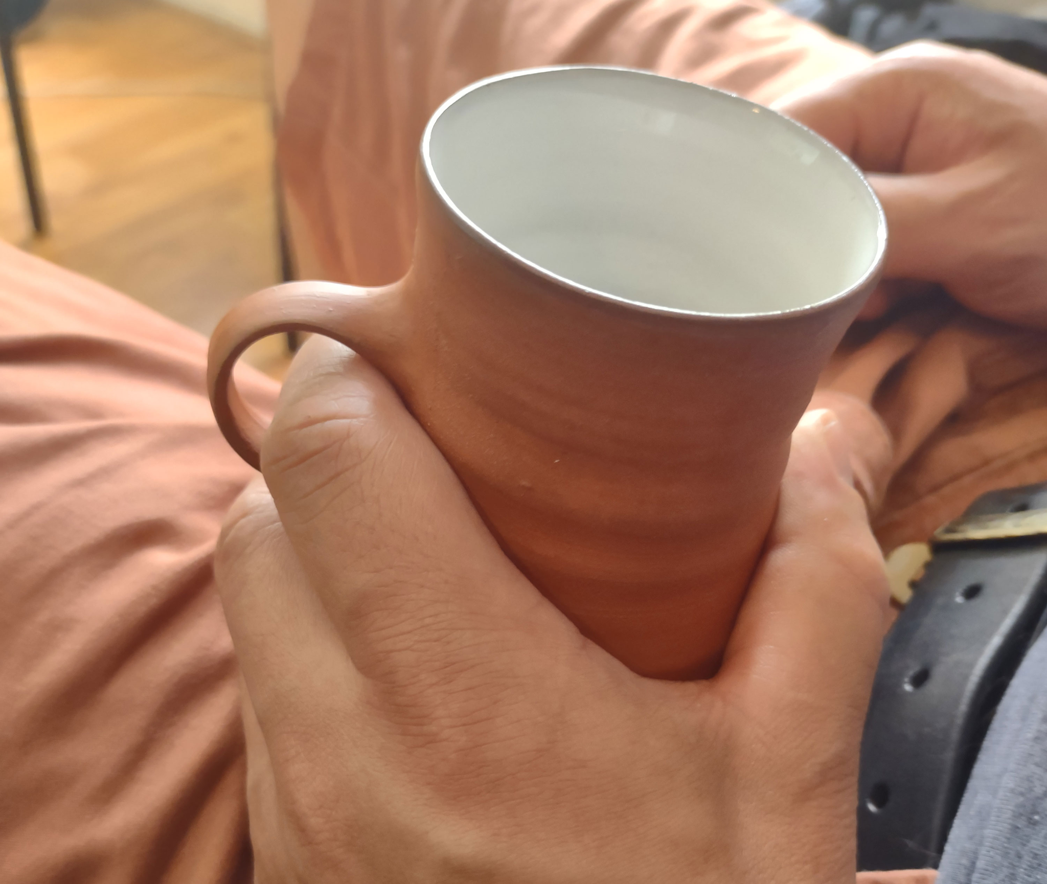 AL Så fint. Men det er jo en evig utforskning og utprøving som jeg holder på med selv hele tida. Og så har du jo tjukkelsen på koppen og det indre volumet og. Så det er alltid mange spørsmål som kommer opp. At innholdet liksom skal være lett tilgjengelig og liksom at kaffen kommer rett i munnen, fordi vinkelen på kanten går ut. Og jeg har alltid med meg de fenomenene med den fysiske styrken.