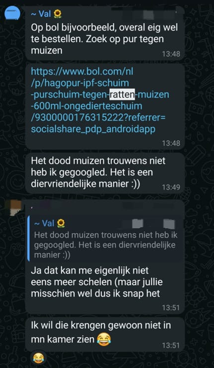 De studenten in mijn wooncomplex lijken dieren vooral vies en eng te vinden. Ze willen ze niet zelf doden. Sommigen wijzen op het vrijlaten van de ratten en dat men echt afval goed moet weghalen etc. Er lijkt dus wel een verband gelegd te worden met menselijke gedrag en het voortkomen van een plaaggeval. Althans zo wordt het ervaren.