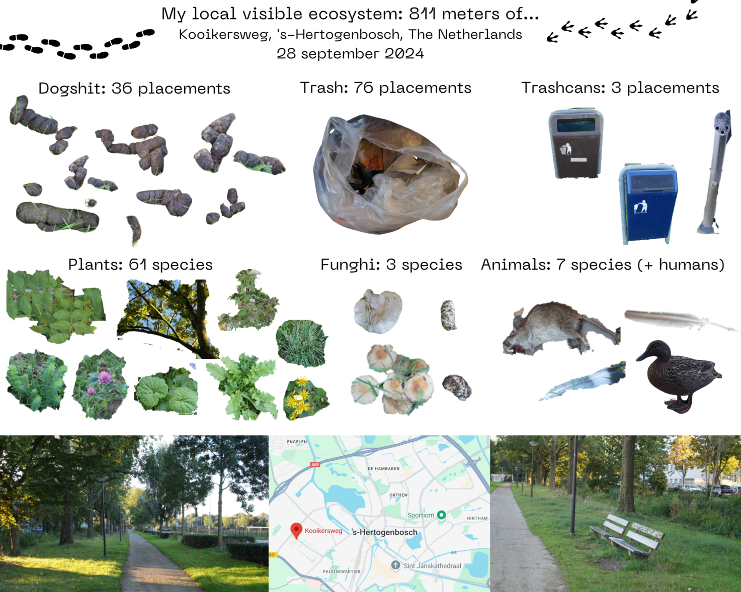 Uiteindelijk heb ik mij op een weg van 811 meter bevonden voor zo'n 3 uur en 200 foto's geschoten. Ik was verbaasd om de omvang van alles wat ik zag, zowel het aantal hondendrollen als de diversiteit aan planten. Het afval heb ik onderweg in een zak gedaan en aan het eind weggegooid. Dit voelde goed om te doen. Onderweg kreeg ik wat duimpjes omhoog. Het lijkt alsof zwerfafval ruimen toch voelt en gezien wordt als een positief effect hebben op het ecosysteem.