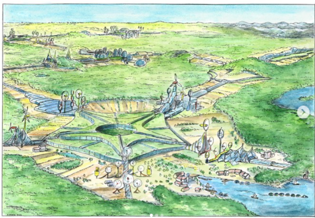 Deze esthetiek romantiseert voor mij een toekomst waarin duurzaam leven centraal staat en technologie en innovatie meehelpen hierbij. Het werk hieronder specifiek, omdat het geillustreerd is alsof een stedenbouwkundige o.i.d. het heeft getekend en het een web bevat. Het werk is van Mark Larochelle.