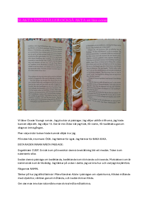 er meget usikker på linjen på s. 17: "Jag läser dom högt för Johanna medan Johanna skrapar sina handleder”.