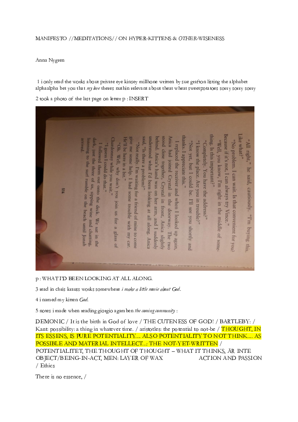DEMONIC / It is the birth in God of love / THE CUTENESS OF GOD! / BARTLEBY: / Kant: possibility: a thing in whatever time. / aristotles: the potential to not-be / THOUGHT, IN ITS ESSENS, IS PURE POTENTIALITY.... ALSO POTENTIALITY TO NOT THINK.... AS POSSIBLE AND MATERIAL INTELLECT...: THE NOT-YET-WRITTEN / POTENTIALITET, THE THOUGHT OF THOUGHT – WHAT IT THINKS, ÄR INTE OBJECT/BEING-IN-ACT, MEN: LAYER OF WAX ACTION AND PASSION / Ethics